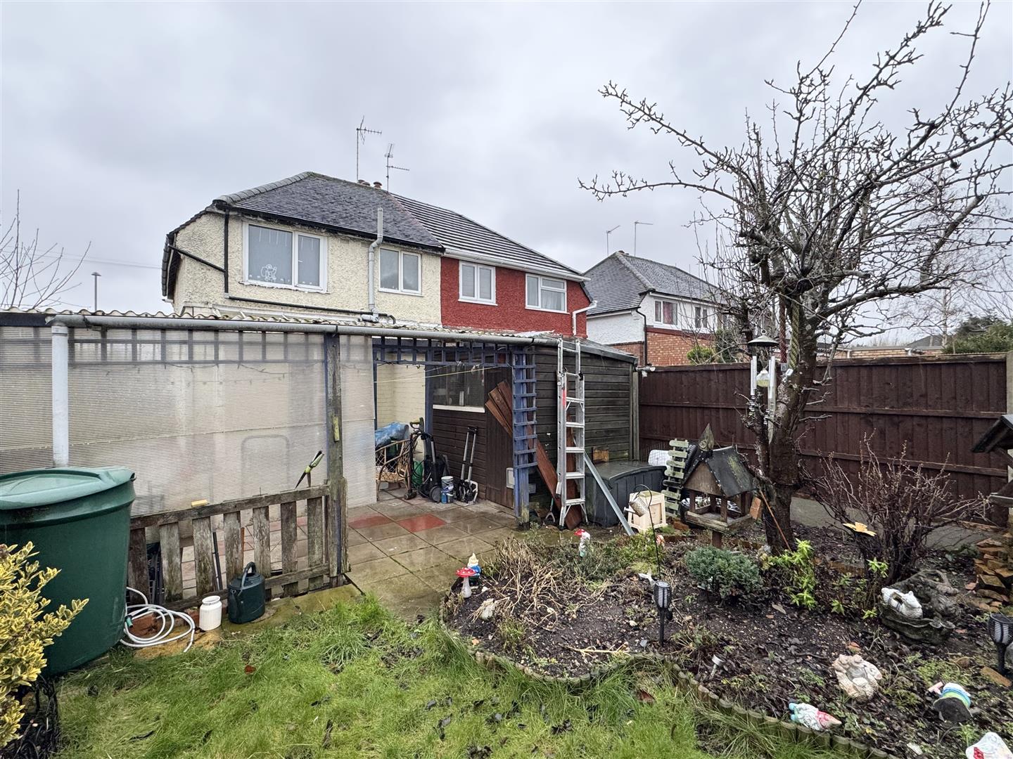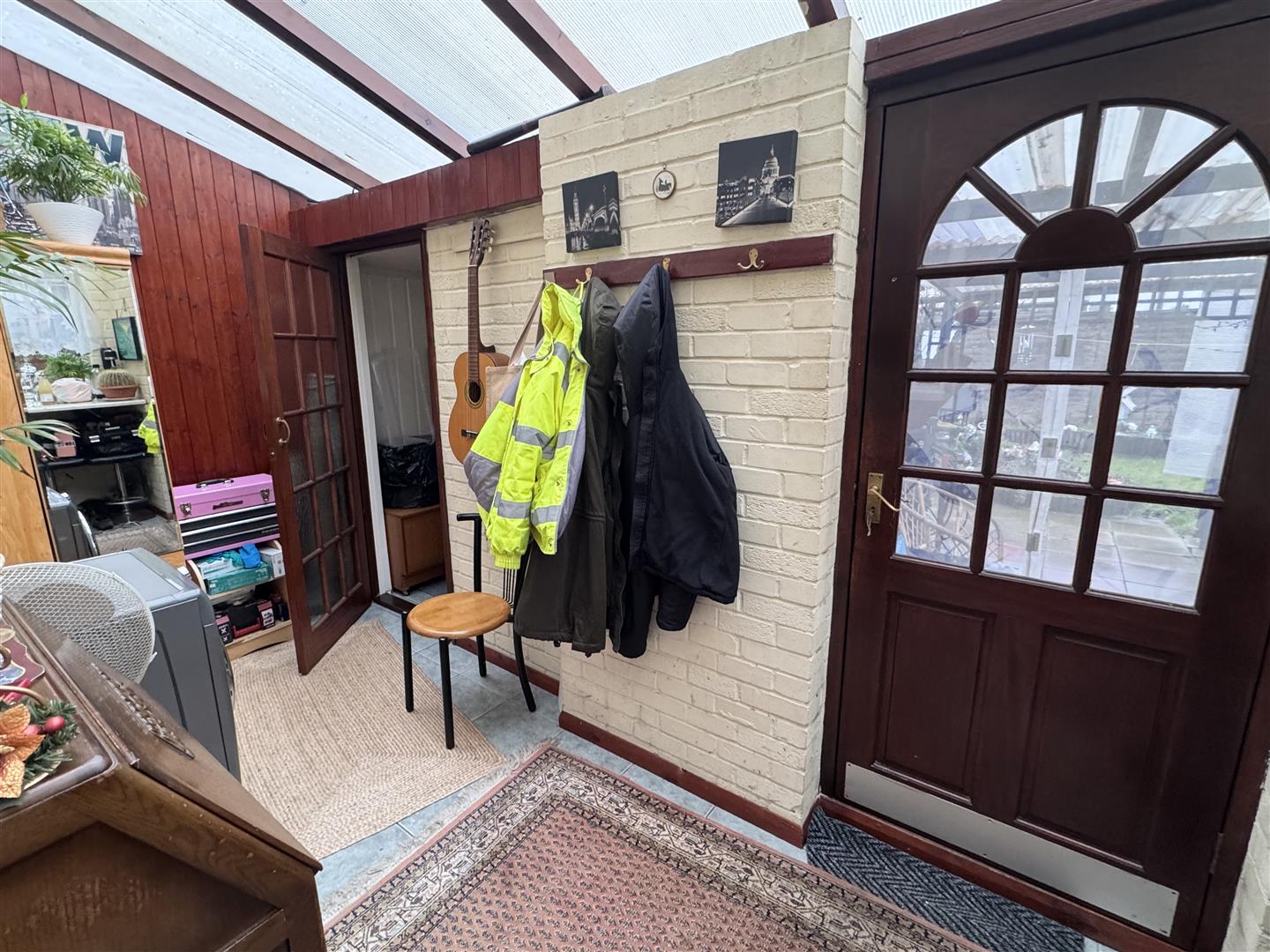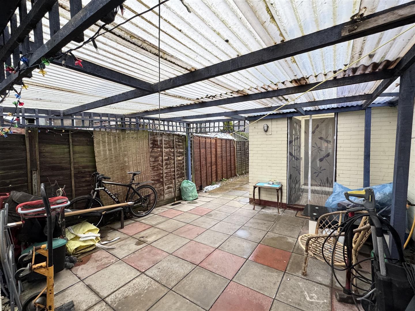 The rear garden is enclosed by timber fencing. Patio area covered with a perspex roof. Lawn area.