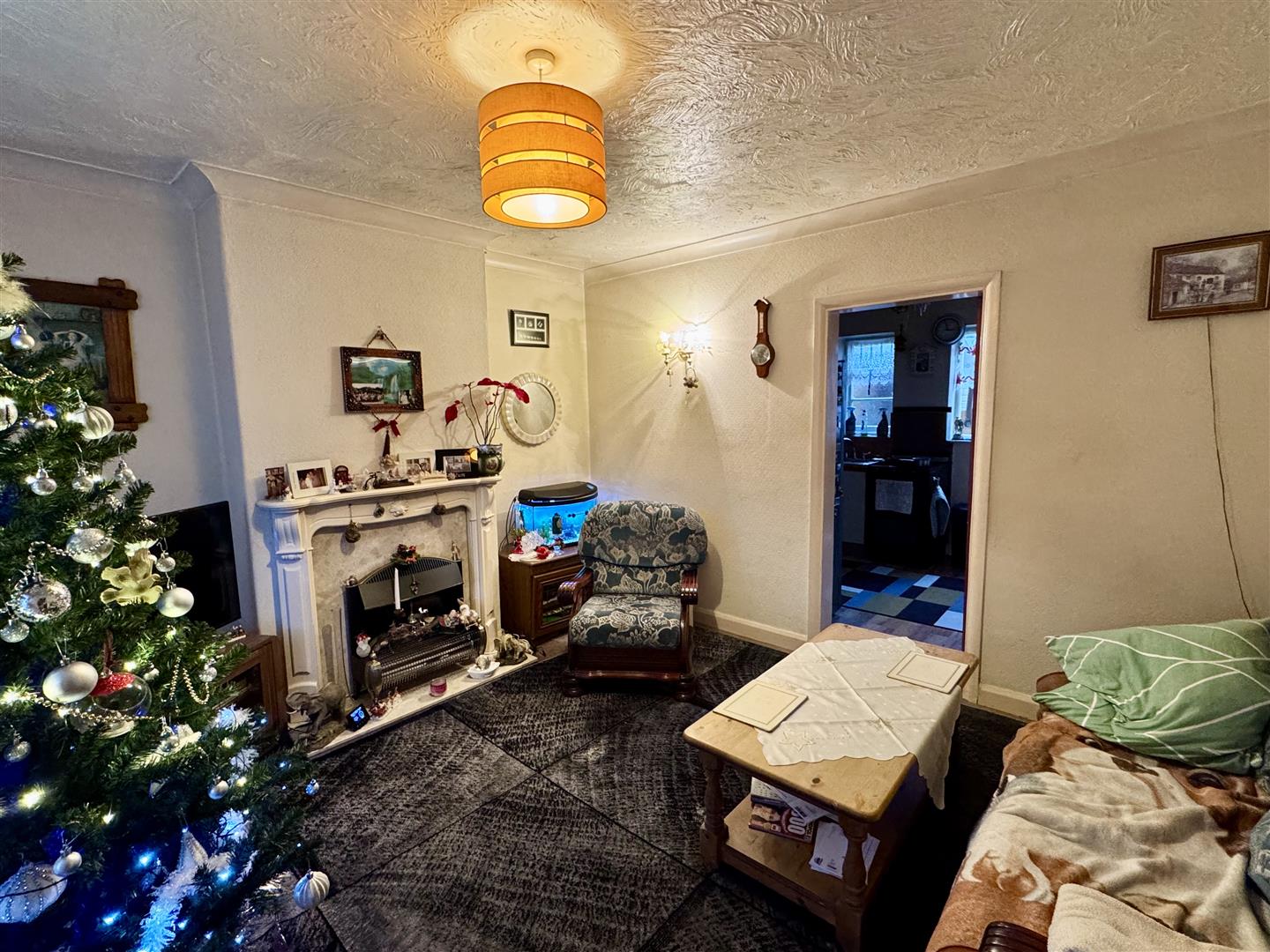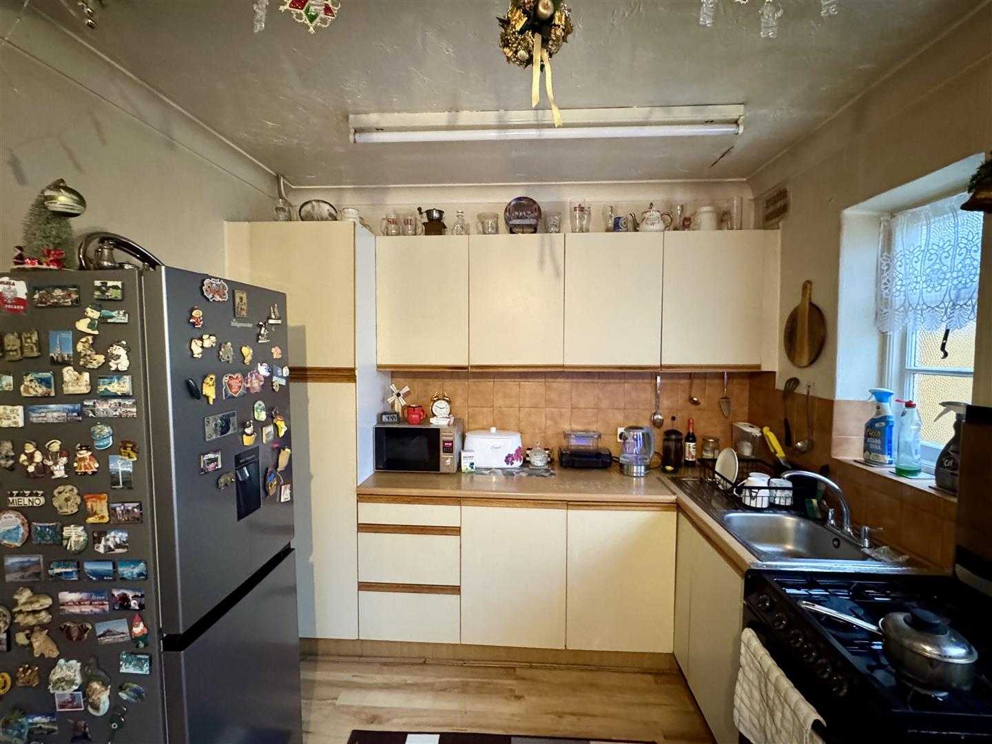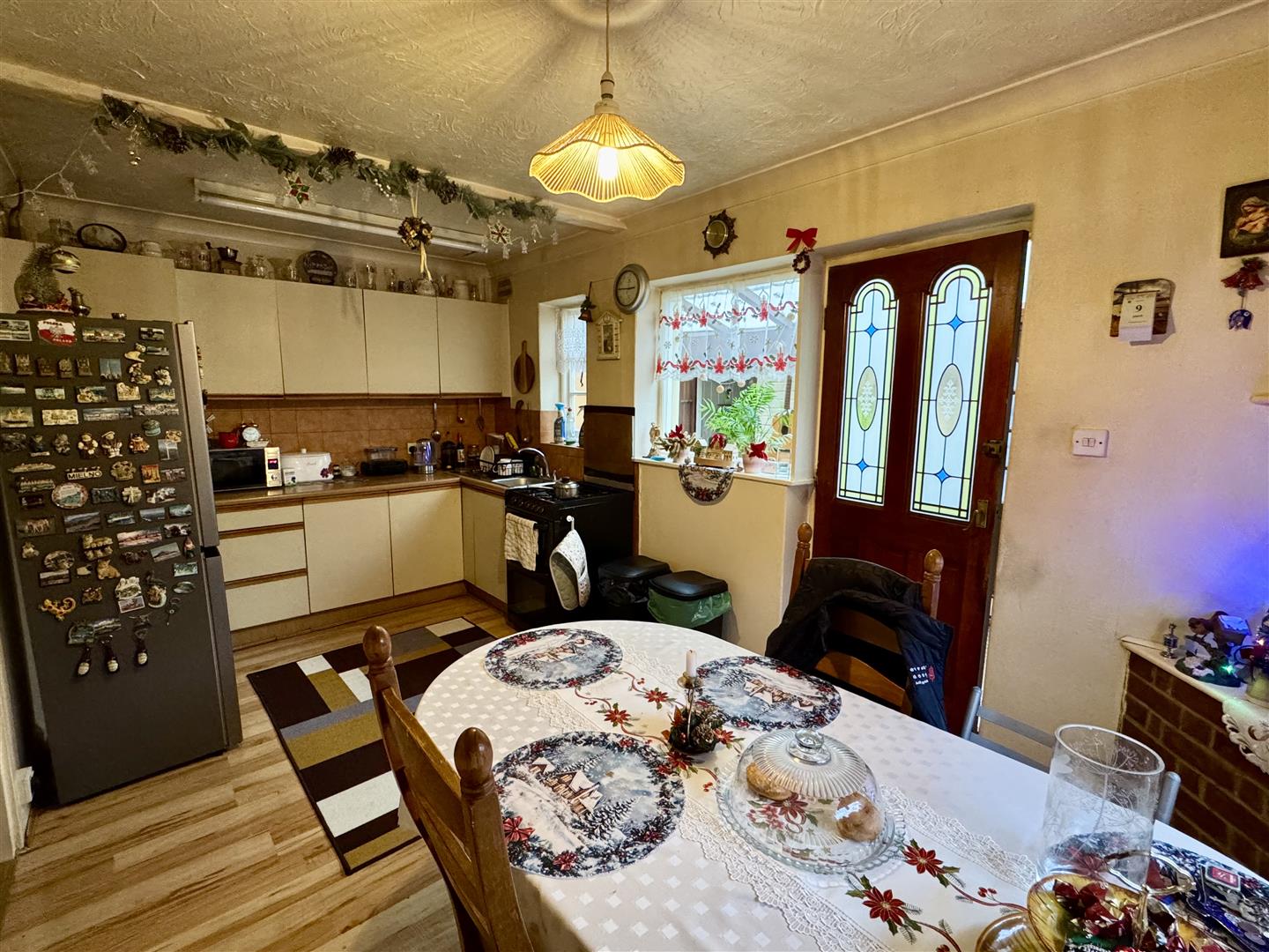 UPVC window and door to rear. Matching base and eye level units with roll edge work surfaces over. Sink unit with drainer and mixer tap. Space for cooker. Space for fridge/freezer. Radiator.