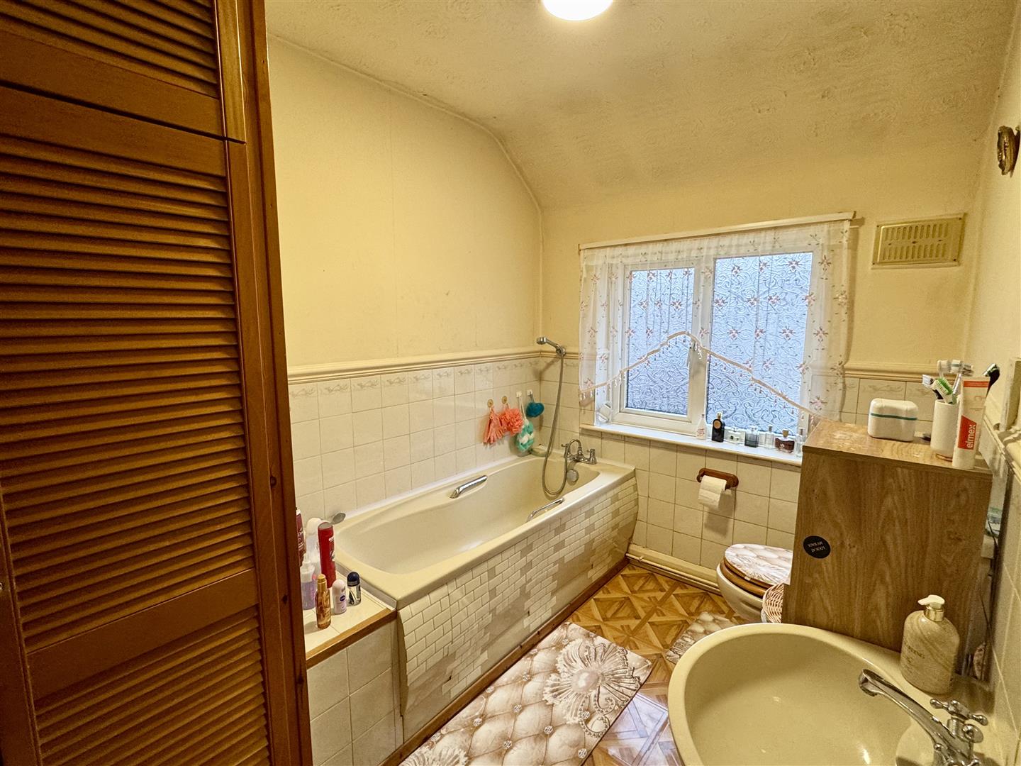Window to rear. Panelled bath with shower over. Pedestal wash hand basin. Toilet. Airing cupboard housing hot water tank and shelving. Radiator.