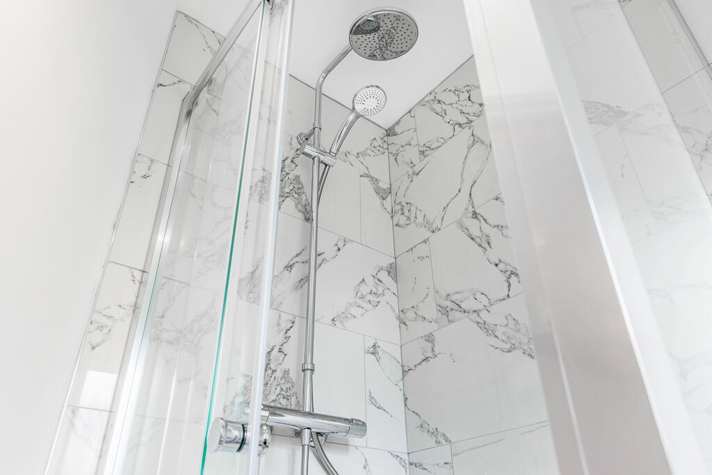 Shower cubicle with toilet and hand basin. Obscured window to front elevation. Heated towel rail. Part tiled walls. Tiled flooring.