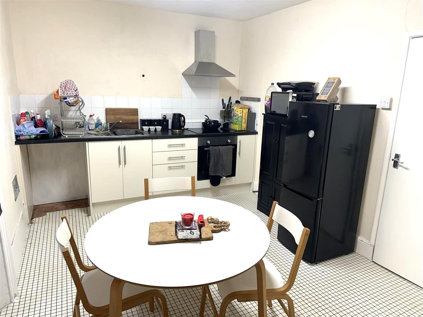 Shared access to fitted kitchen with upper and lower units. Integrated cooker, hob and extractor. Stainless steel sink and mixer tap.