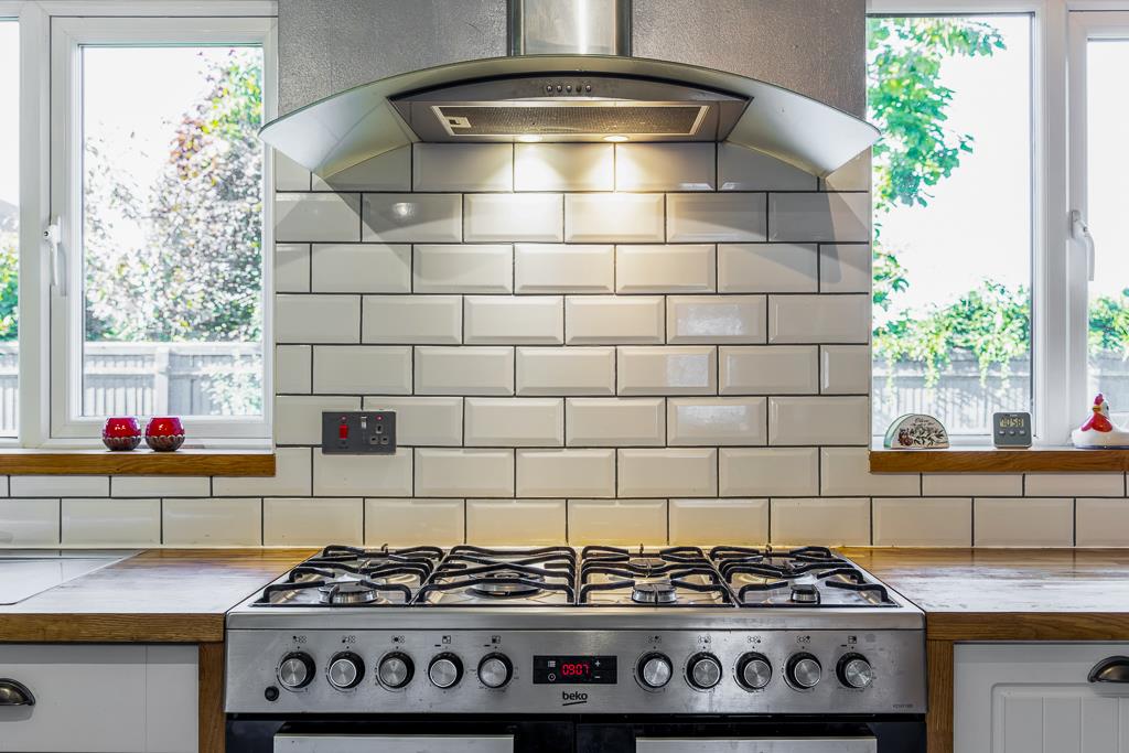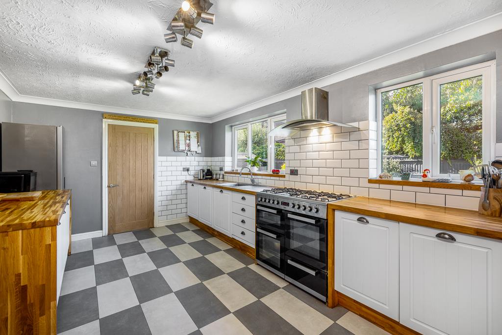 Two UPVC windows to rear. Matching base and eye level units with work surfaces over. Partially tiled walls. Sink unit with drainer and mixer tap over. Space for free standing Rangemaster cooker with stainless steel extractor hood over. Integrated washing machine and dishwasher. Radiator. Tiled flooring.