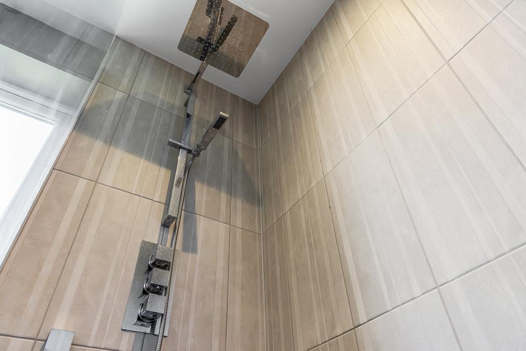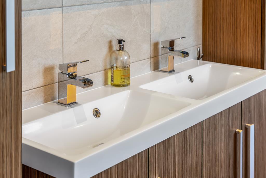 Two UPVC windows to rear. Oval bath with mixer tap over. Tiled shower enclosure with rainfall head and separate shower attachment. Twin wash hand basins set in vanity unit. Concealed cistern toilet. Tiled walls. Two wall mounted heated towel rails. Wood effect porcelain tiled floor