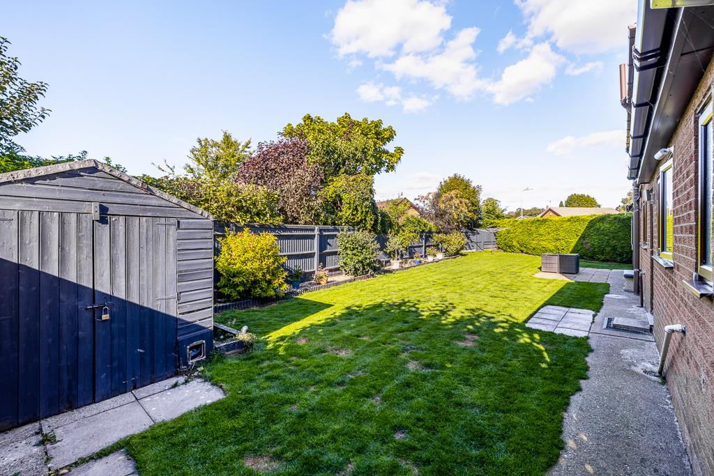 The rear garden is enclosed by timber fencing. Lawn area. Patio seating area.