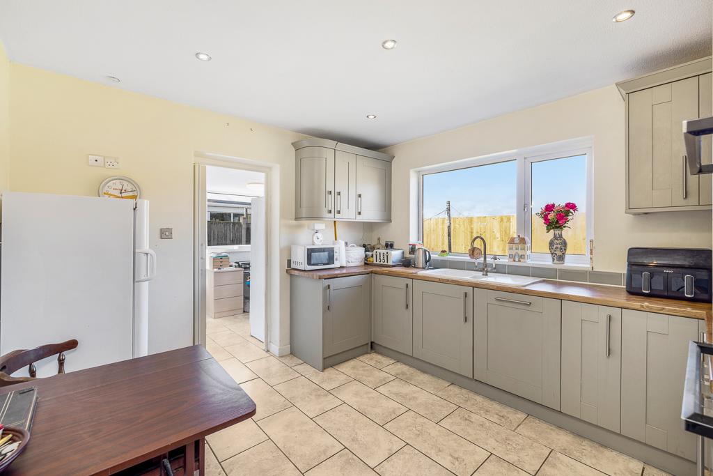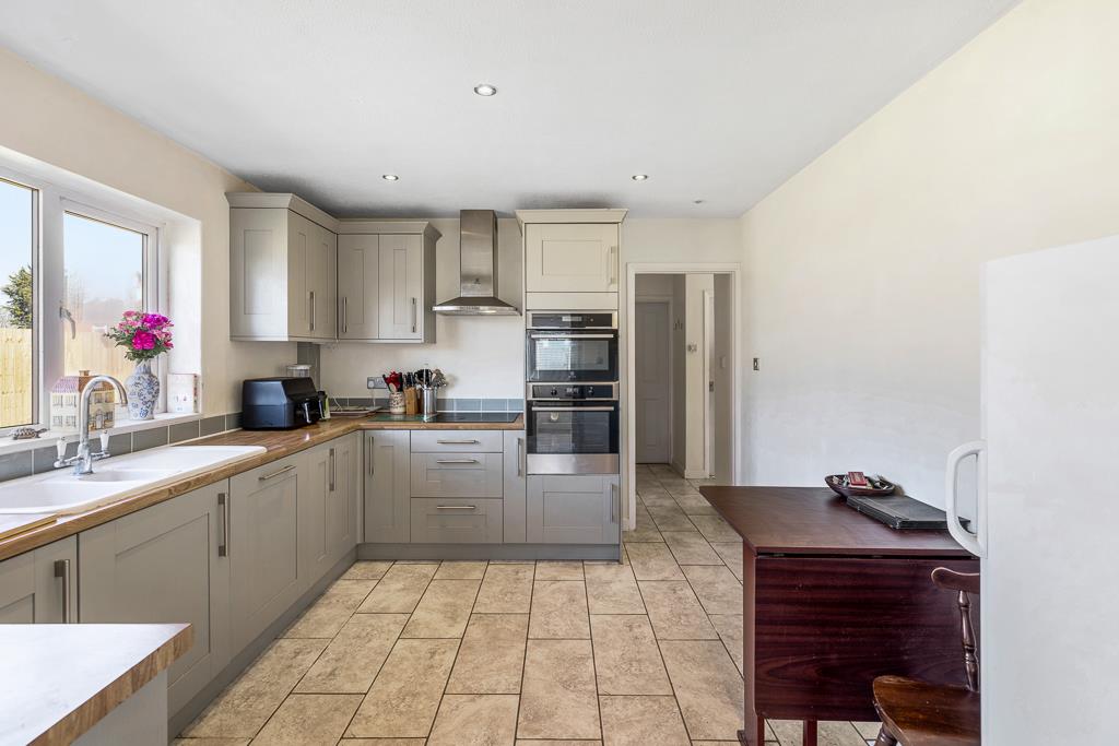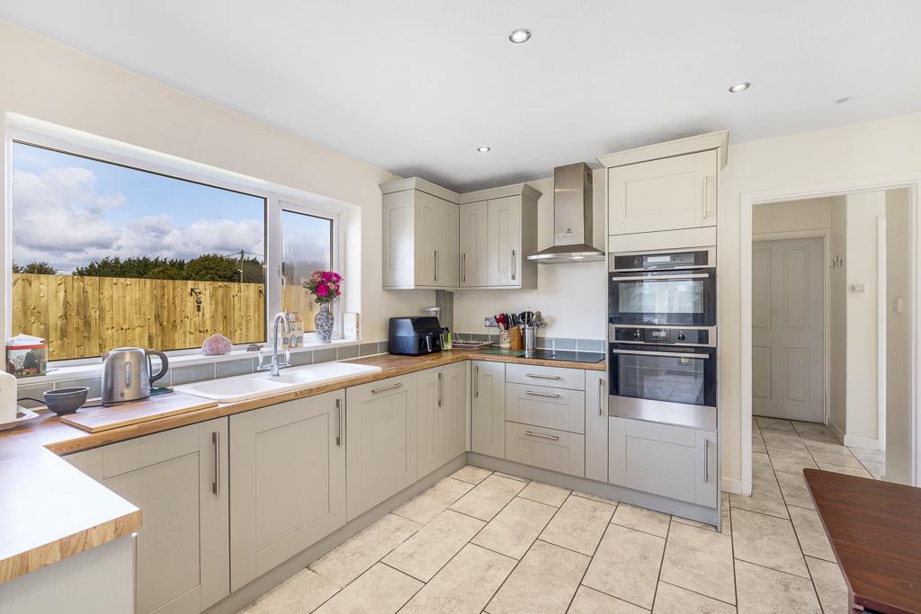 UPVC window to rear. Matching range of base and eye level units with work surfaces over. Sink unit with drainer and mixer tap. Electric hob with extractor hood over. Built in eye level oven and grill. Integrated dishwasher. Integrated fridge. Tiled flooring. Underfloor heating.
