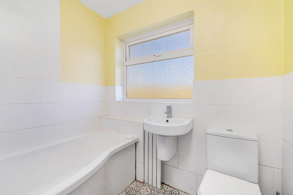 UPVC window to rear. Panelled bath with shower over. Toilet. Wash hand basin. Partially tiled walls. Tiled flooring. Radiator.