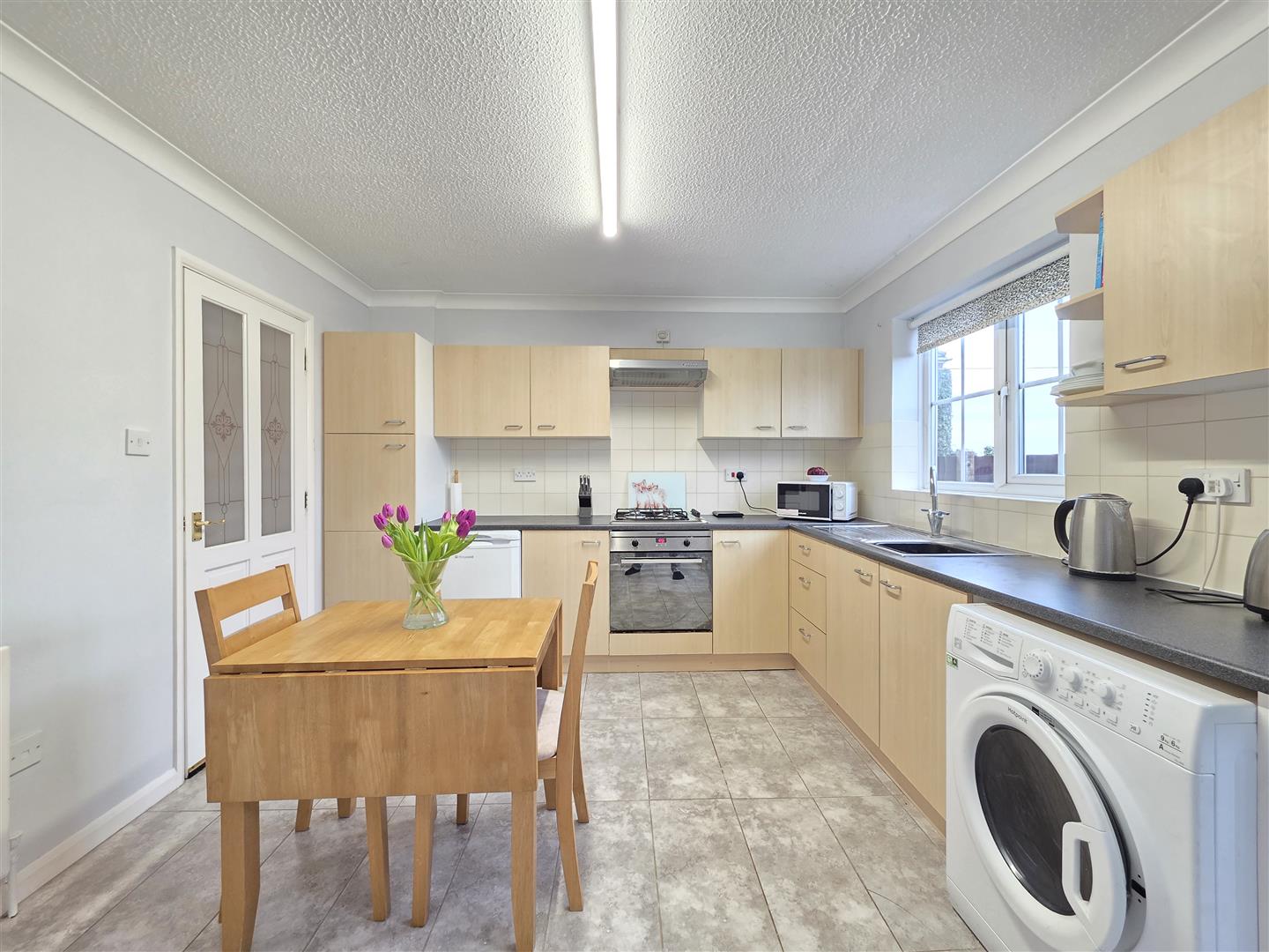 PVC double glazed window to rear. Coving to ceiling. Tiled flooring. Radiator. Fitted with a matching range of base and eye level units with roll edge work surface and tiled splash back. Four ring gas hob with stainless steel extractor hood over. Integrated oven and grill under. Stainless steel single sink drainer with chrome mixer tap. Space and plumbing for washing machine. Space for under counter fridge/freezer. Space for fridge/freezer. PVC double glazed door opening to garden.