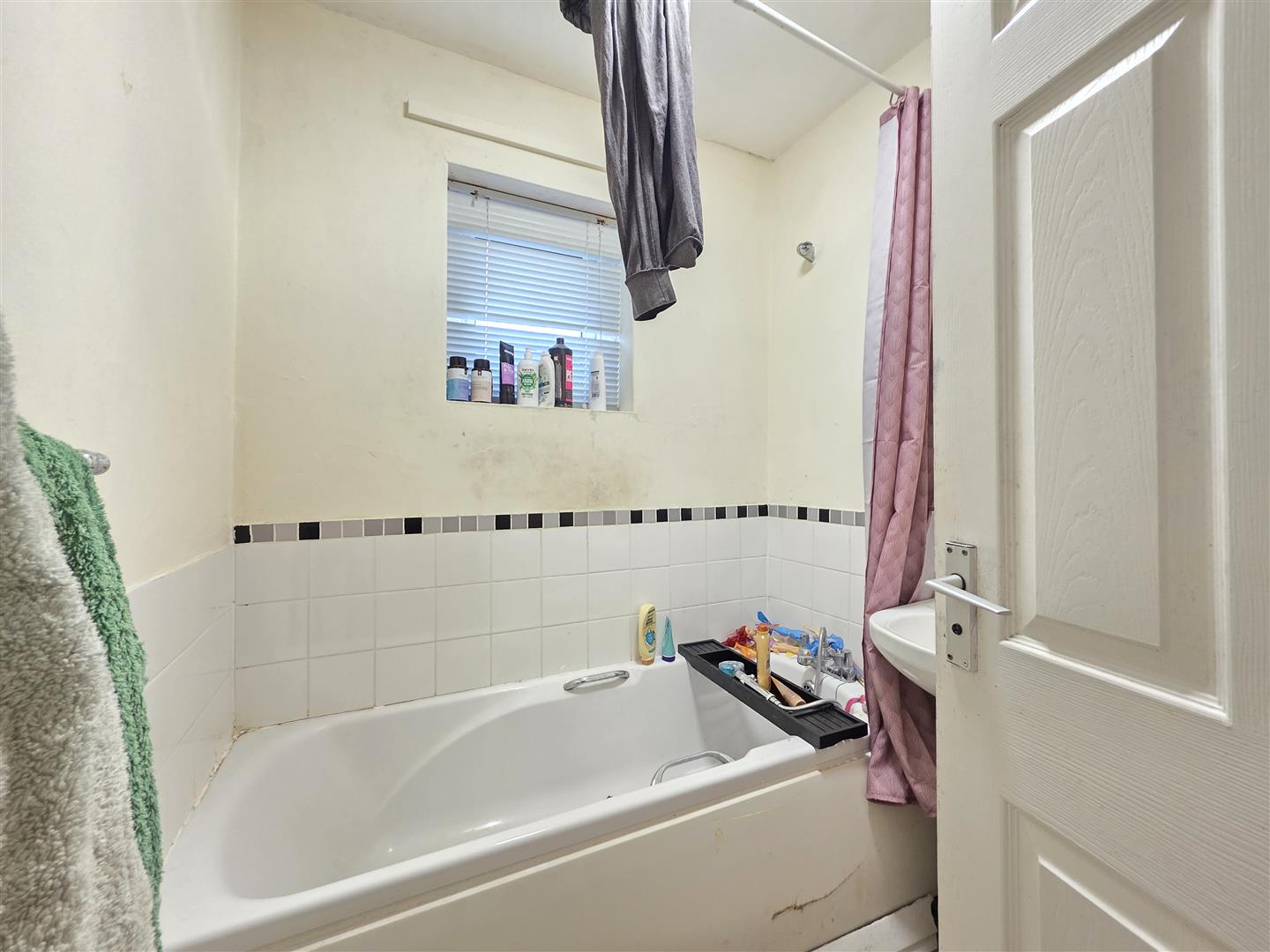 PVC double glazed window to rear. Panelled bath with mixer tap and shower over. Pedestal wash hand basin. Toilet. Partially tiled walls. Radiator. Vinyl flooring.
