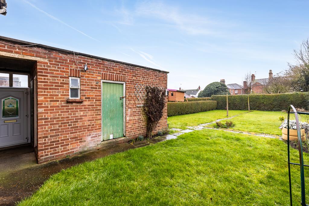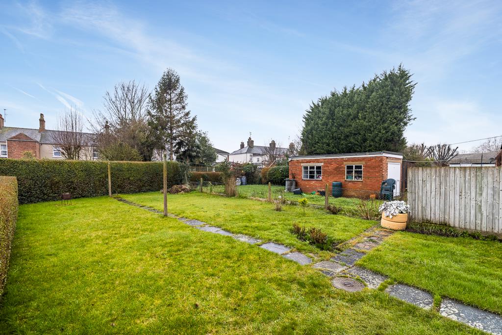 The rear garden is enclosed by timber fencing and hedging. Lawn area.