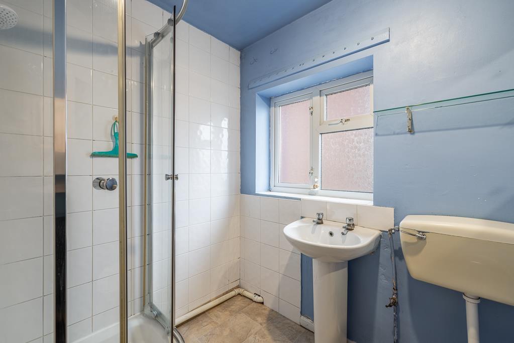 UPVC window to side. Corner shower cubicle. Wash hand basin. Toilet. Partially tiled walls. Tiled flooring.