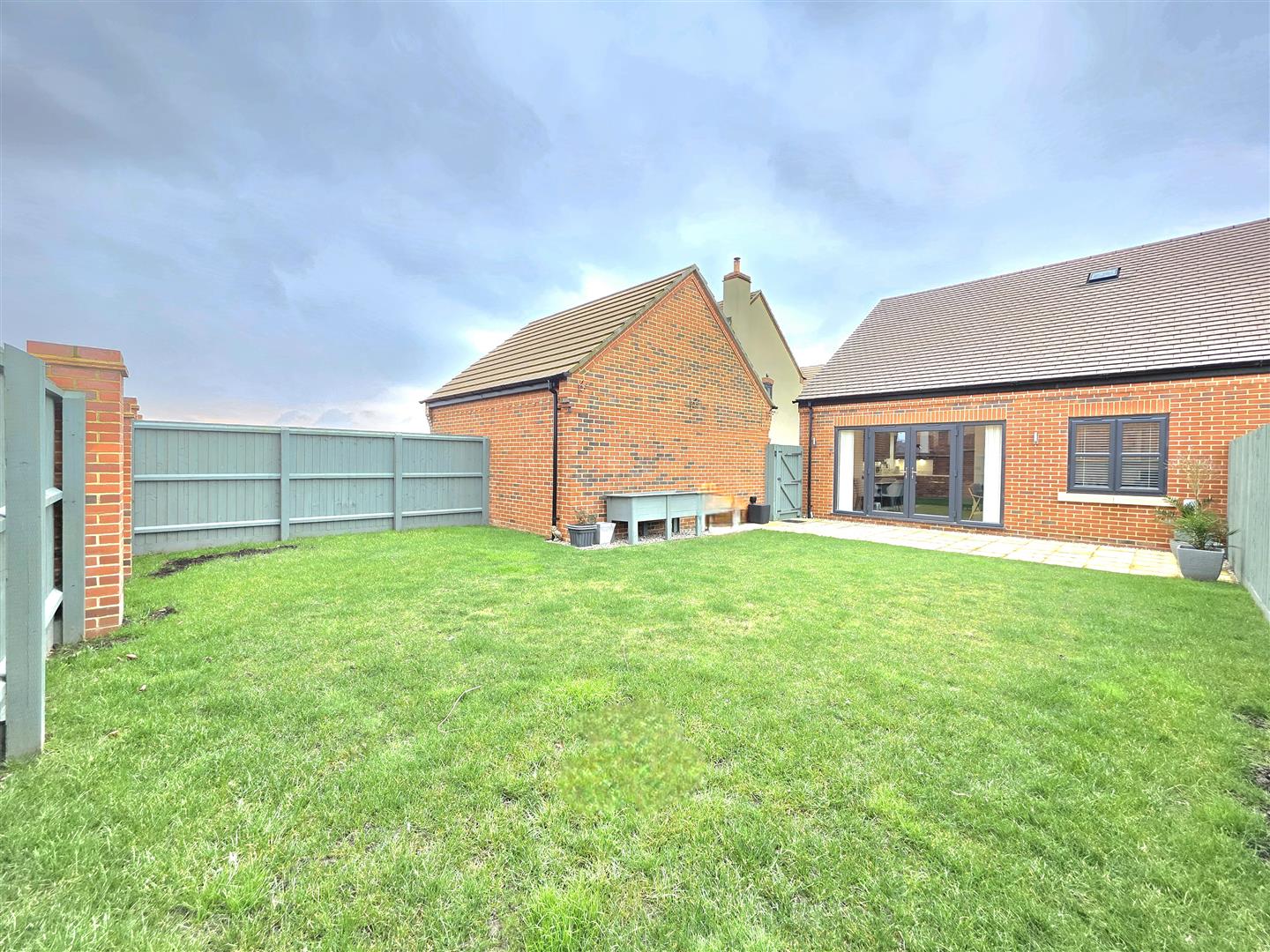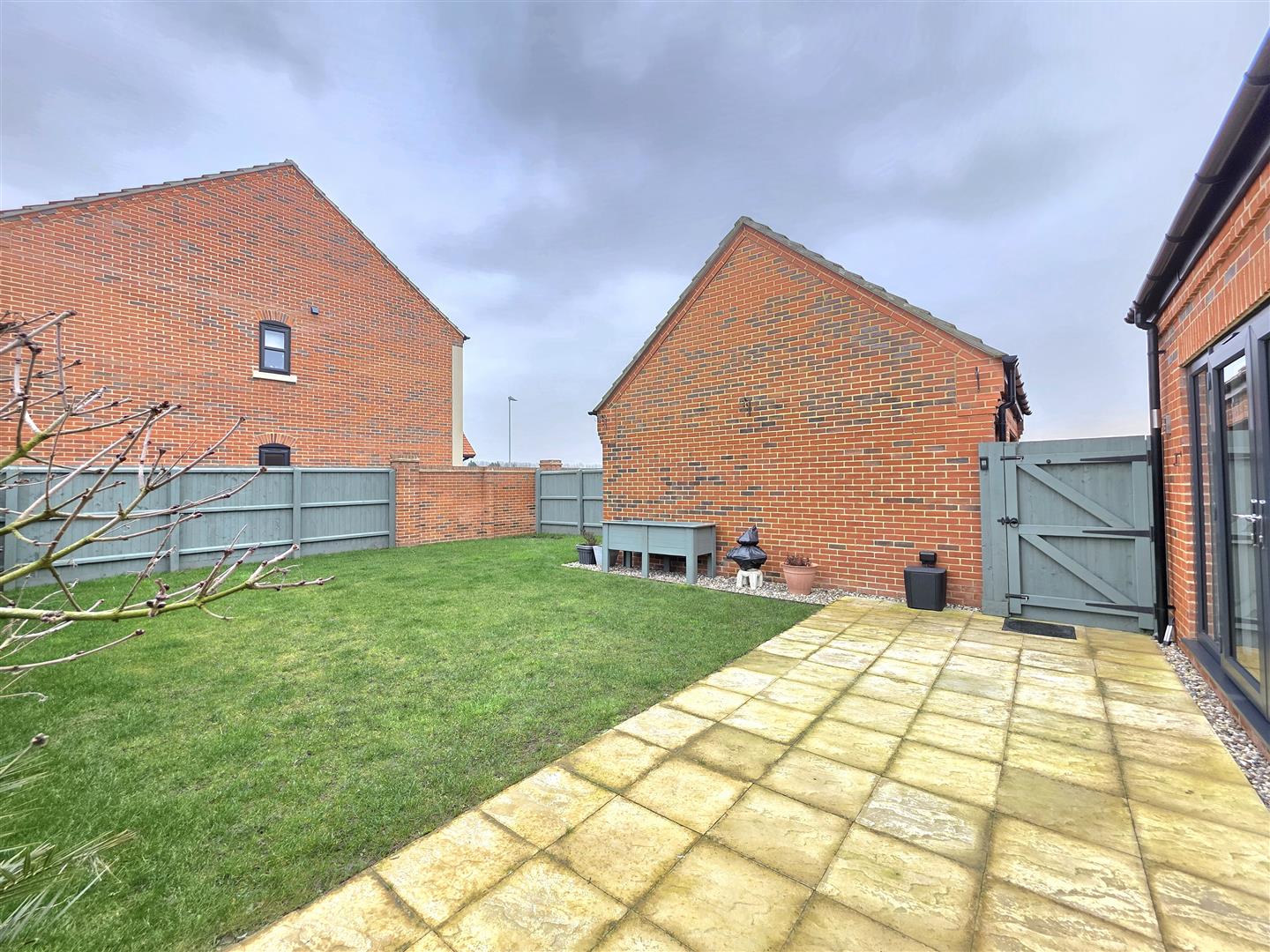 The rear garden is enclosed by timber fencing. Lawn area.