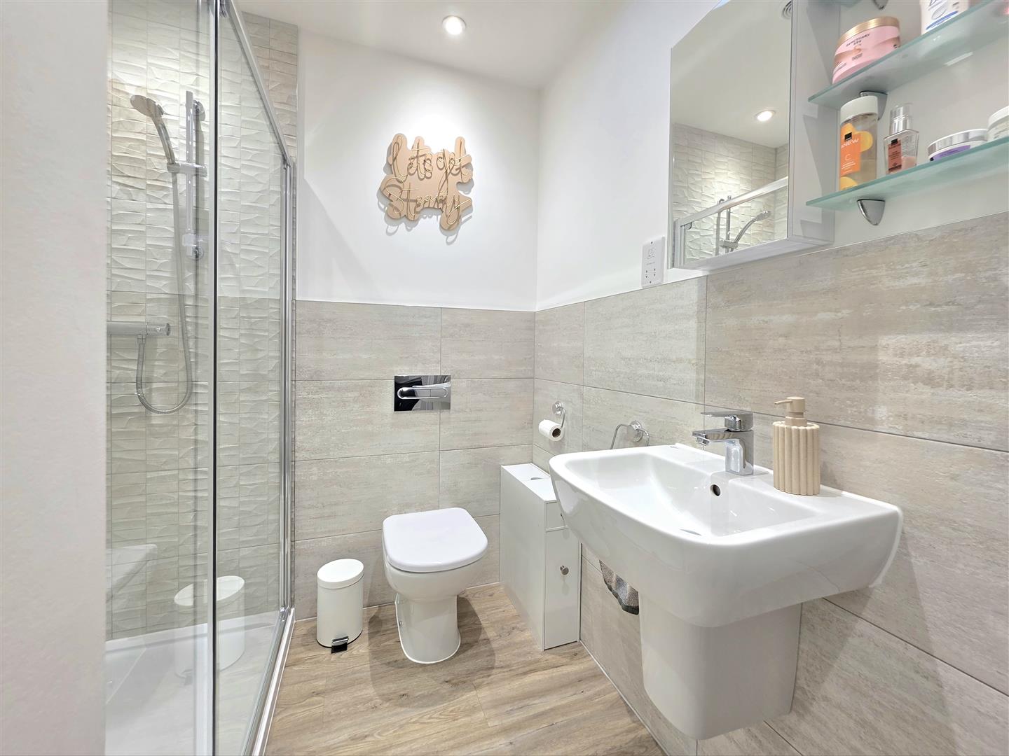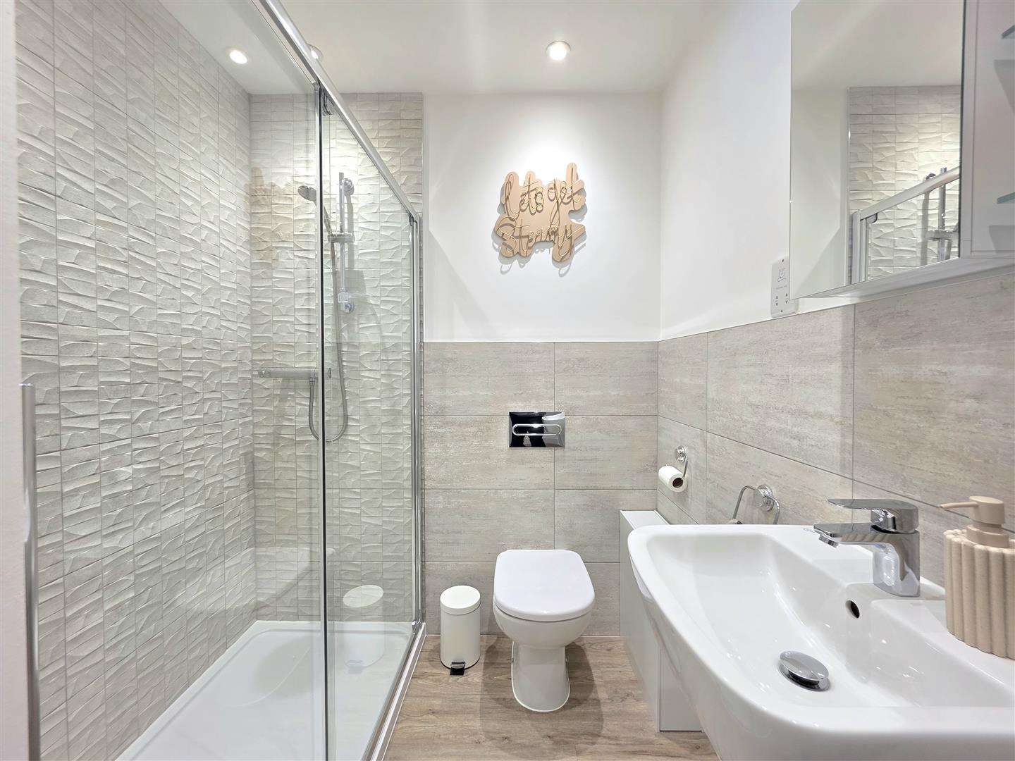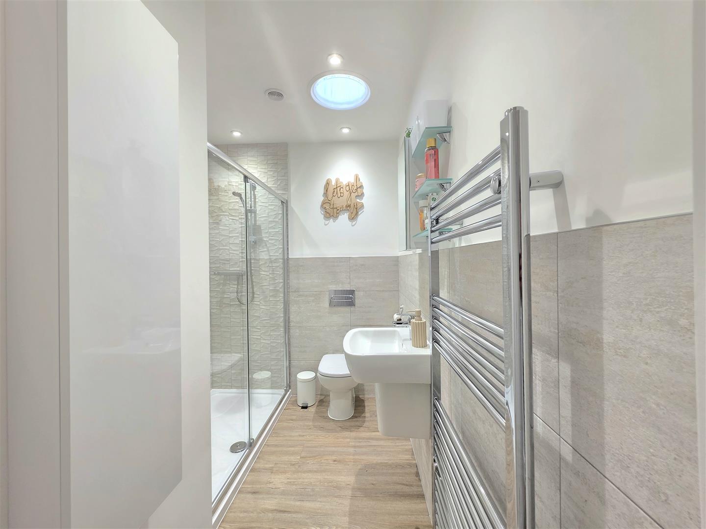 Velux window. LVT flooring. Fully tiled walls. Three piece suite with double shower. Toilet. Wash hand basin. Heated towel rail.
