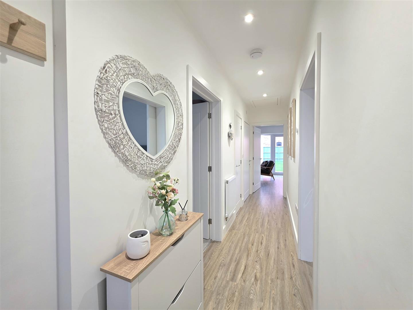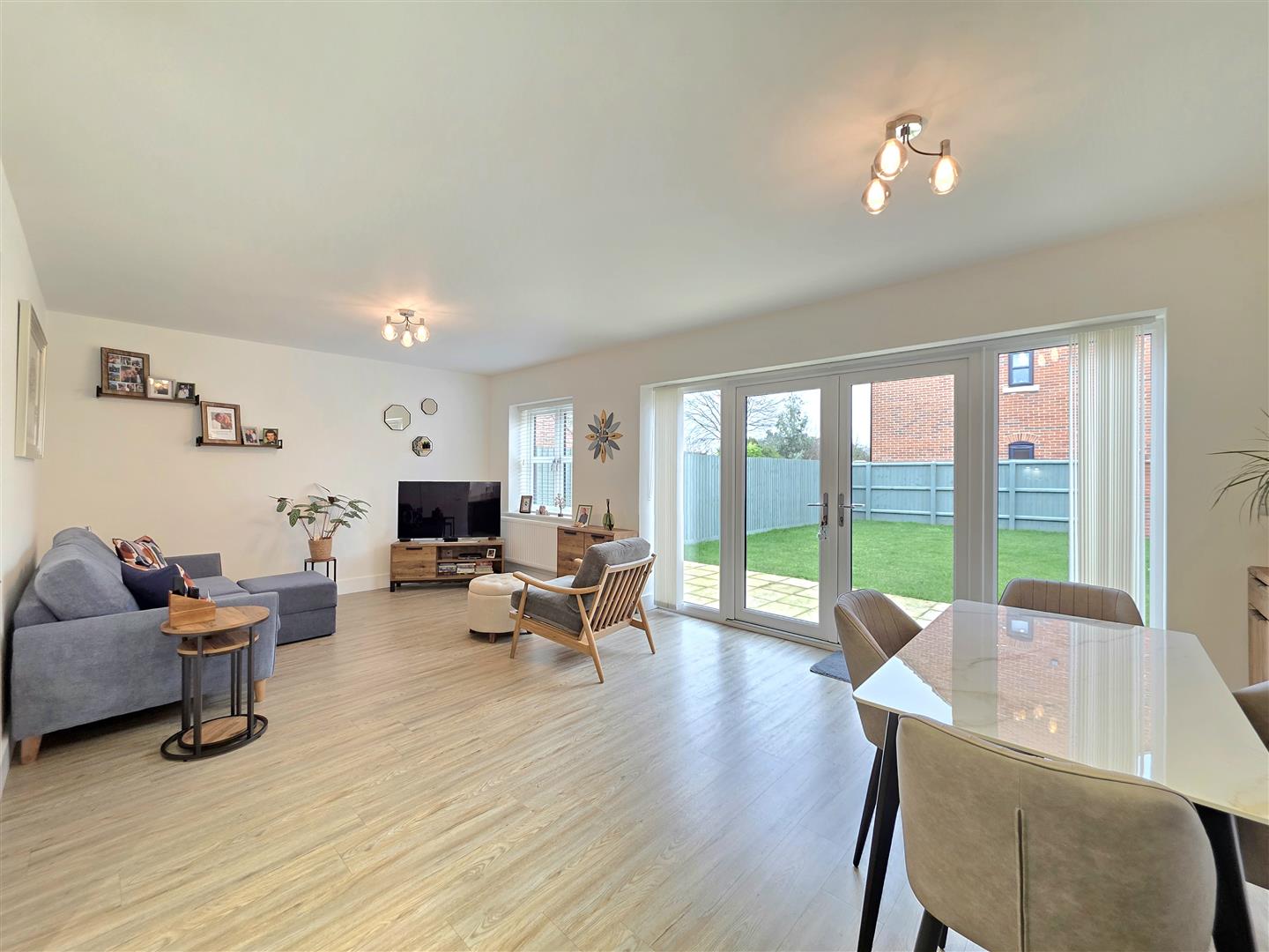 PVC double glazed windows to side and rear. Double French doors to rear. Radiator. LVT flooring. Matching base and eye level units with work surfaces over. Integrated fridge freezer. Integrated washing machine. Integrated dishwasher.