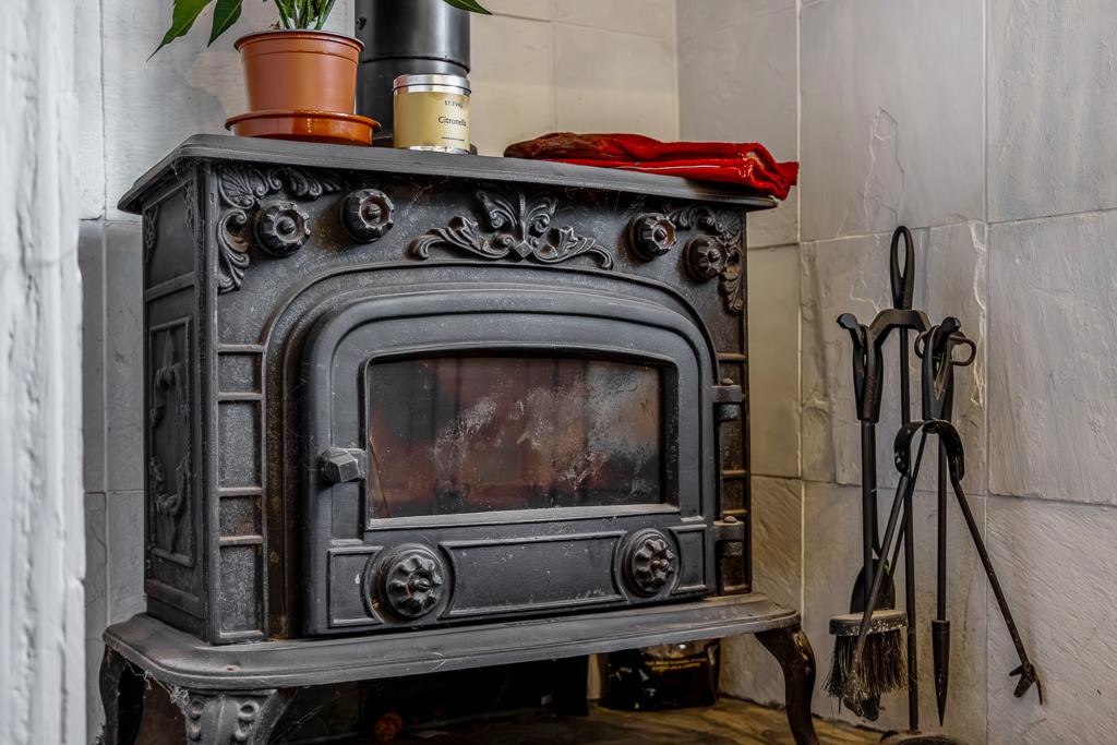 UPVC window to side. Fitted with a matching range of base and eye level units with solid wood worktop space over. Sink with mixer tap. Space for cooker with extractor hood over. Tiled flooring. Built-in storage cupboard. Radiator. Inset wood burner.