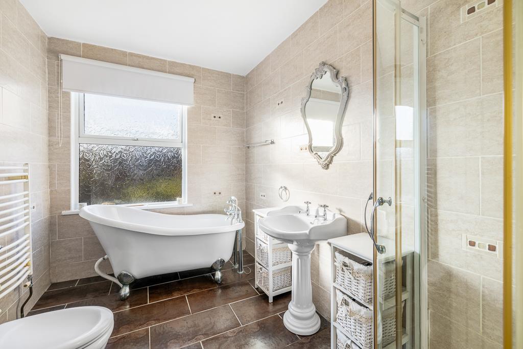 UPVC window to side. Fitted with a four piece suite comprising a bath. Shower enclosure. Pedestal wash hand basin and toilet. Heated towel rail. Tiled flooring.