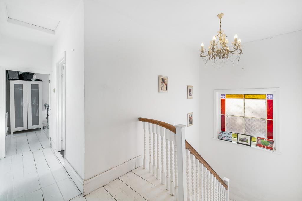 Stairs leading to second floor landing. Doors to bedrooms and bathroom. Wooden flooring.
