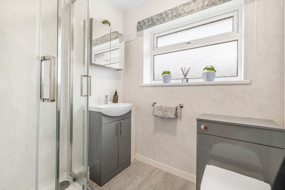 PVC double glazed window to rear, fitted shower cubicle with sliding doors and mains thermostatic bar shower, concealed cistern toilet with push button flush and was hand basin set in vanity unit with built in storage.