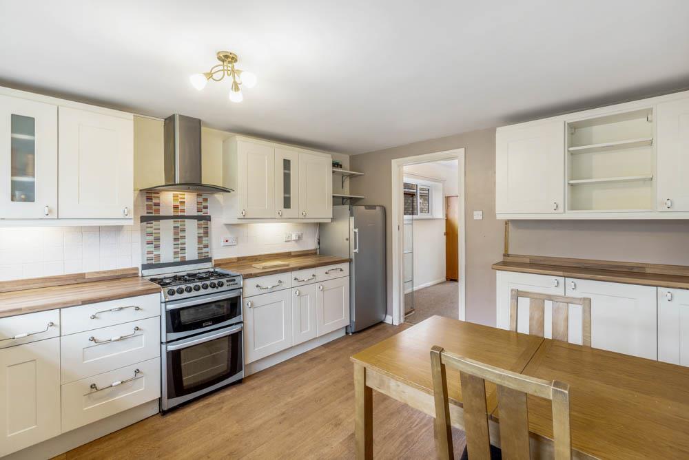 PVC double glazed window to rear and side. Skimmed ceiling. Matching range of base and eye level units with work surfaces over and tiled splash backs. Space for free standing gas oven. Extractor fan. Space for fridge/freezer. Space and plumbing for dishwasher. Space and plumbing for washing machine. Radiator. Wood effect flooring.
