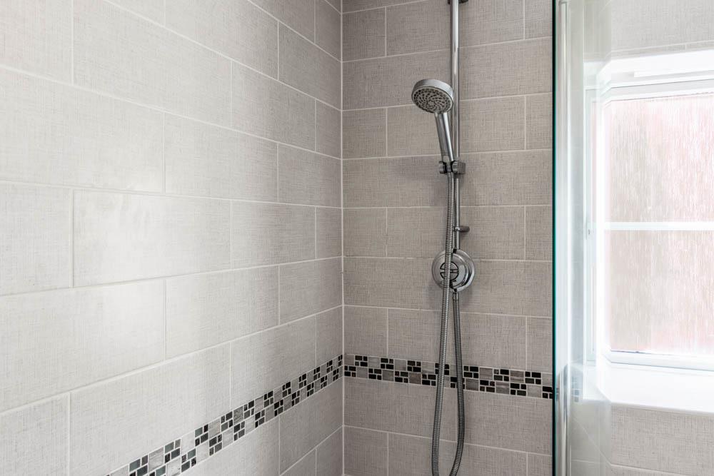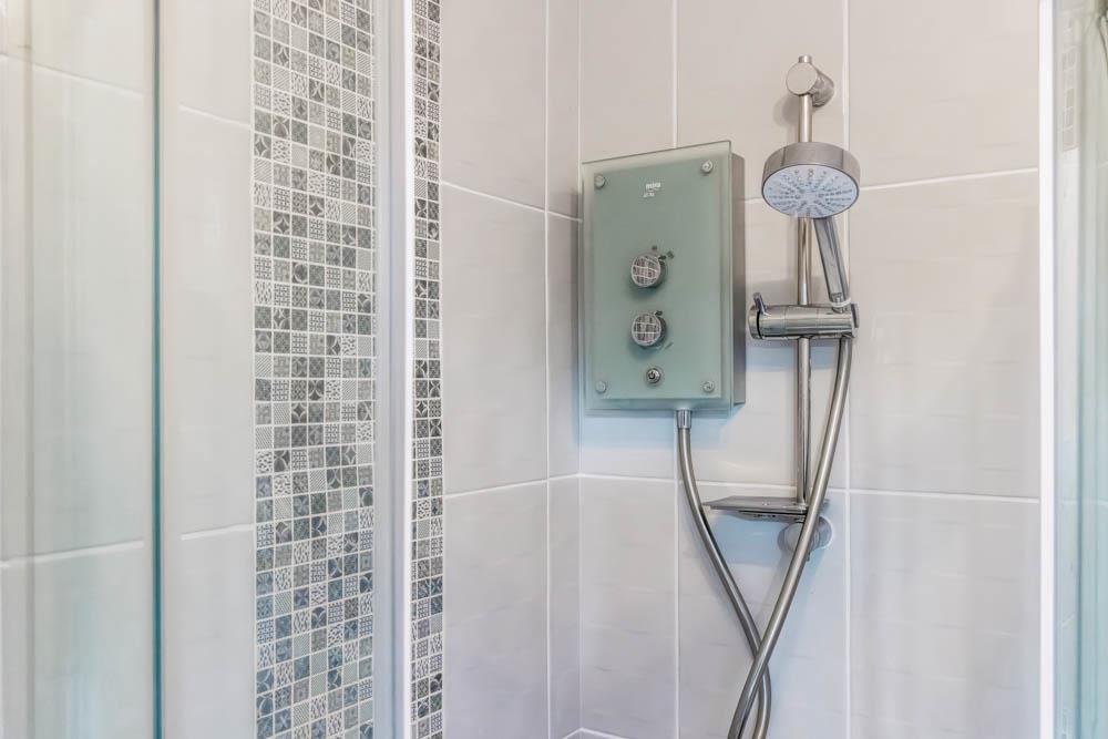 Corner shower cubicle with electric shower. Toilet. Wash hand basin set in vanity unit. Partially tiled walls. Heated towel rail. Extractor fan. Vinyl tiled flooring.