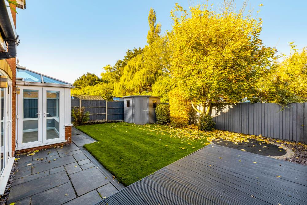 The rear garden is enclosed by timber fencing. Lawn area. Patio seating area. Timber decking area. Timber shed. Outside tap. Outside power socket.