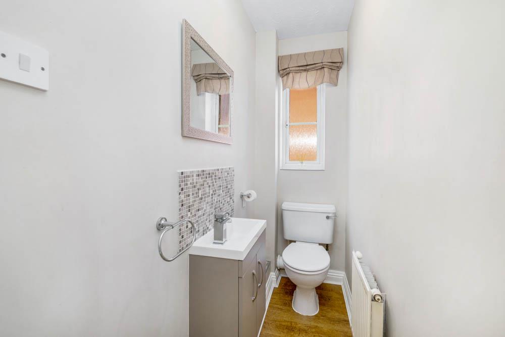 UPVC window to side. Toilet. Wash hand basin set in vanity unit with tiled splash back. Wood effect flooring. Radiator.