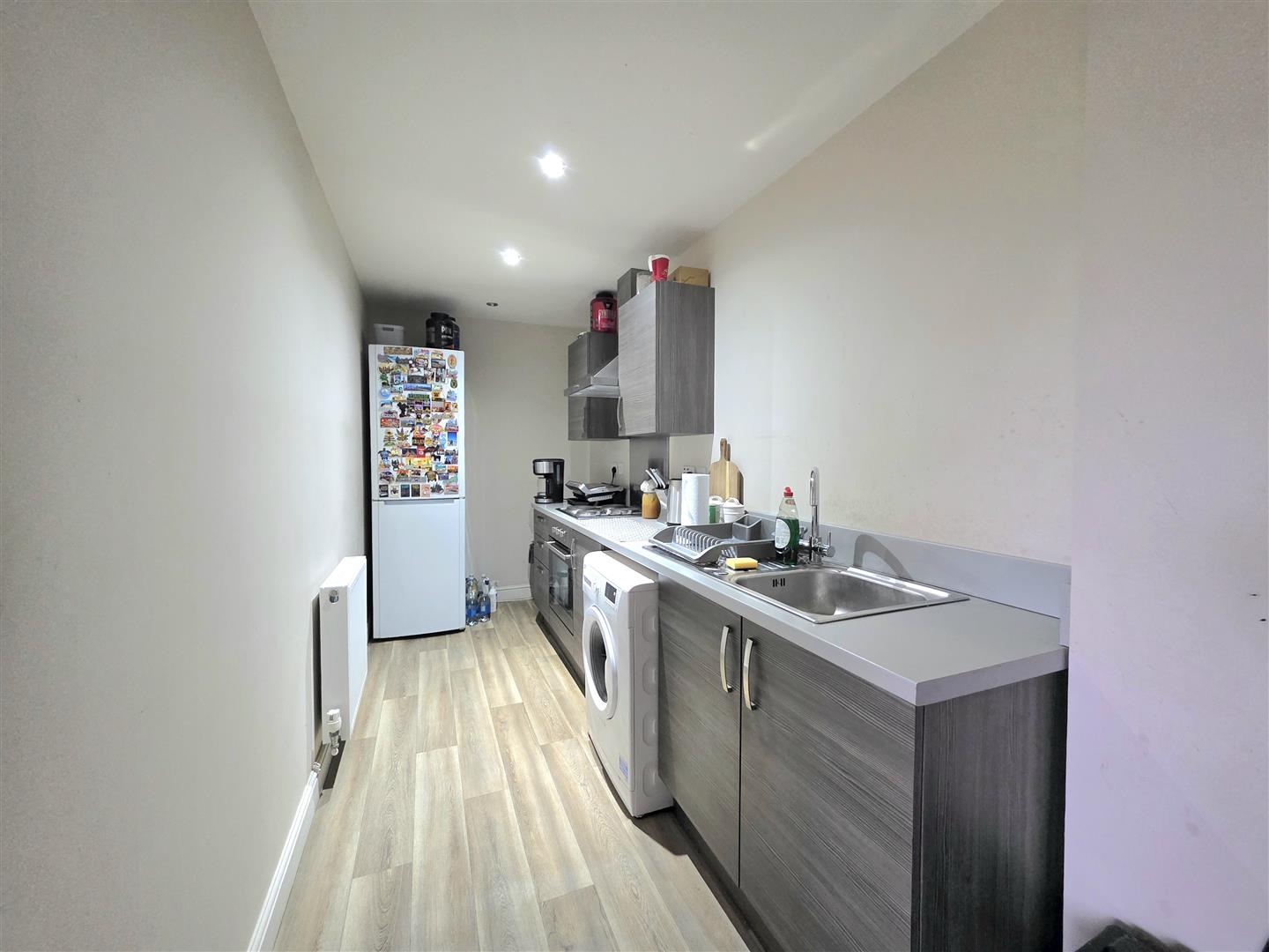 Skimmed ceiling with recessed spotlights, vinyl flooring, radiator. Fitted base and eye level units with worktop space, four ring electric hob with extractor hood over and electric oven and grill under, stainless steel sink and drainer with chrome mixer tap over. Space for fridge freezer, space and plumbing for washing machine.
