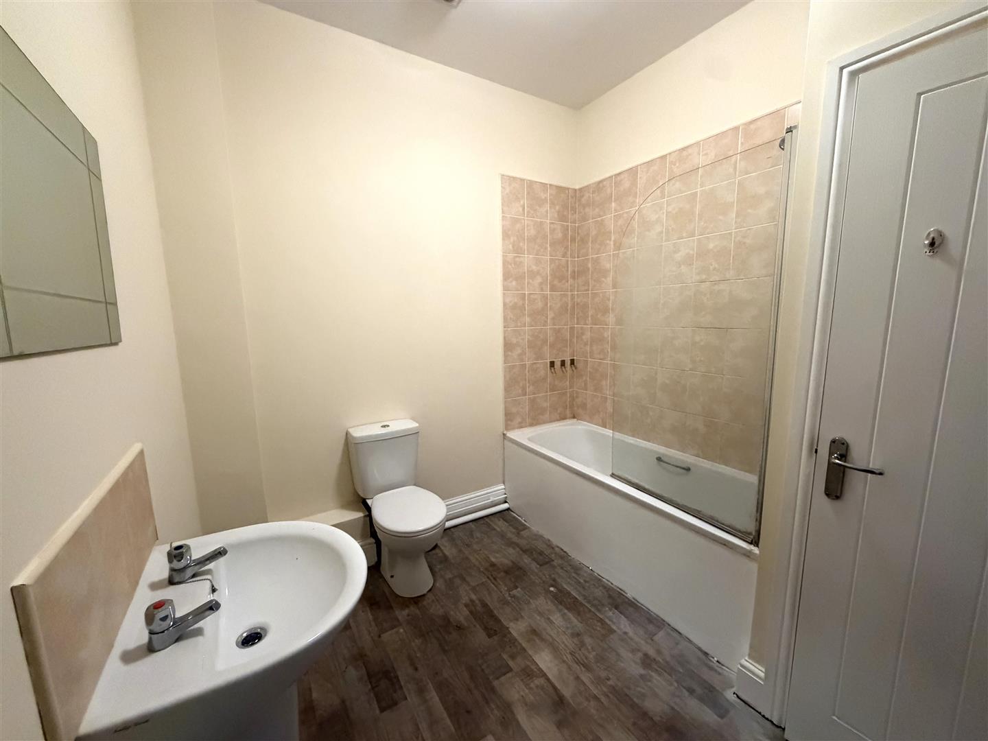 Fitted with a W/C, hand basin and bath with shower over. Airing cupboard for storage. Lino flooring and radiator.