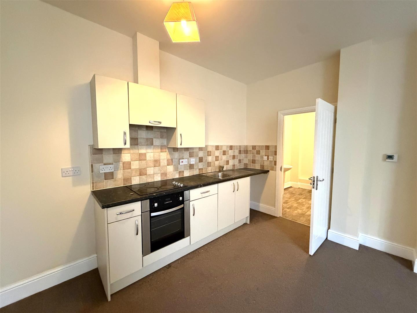 Open plan kitchen and living area fitted with a range of base and eye level units and an electric hob. Space for a fridge and washing machine. Carpeted flooring, radiator and window to the side aspect. Front entrance door and intercom system. Doors leading to the bathroom and both bedrooms.