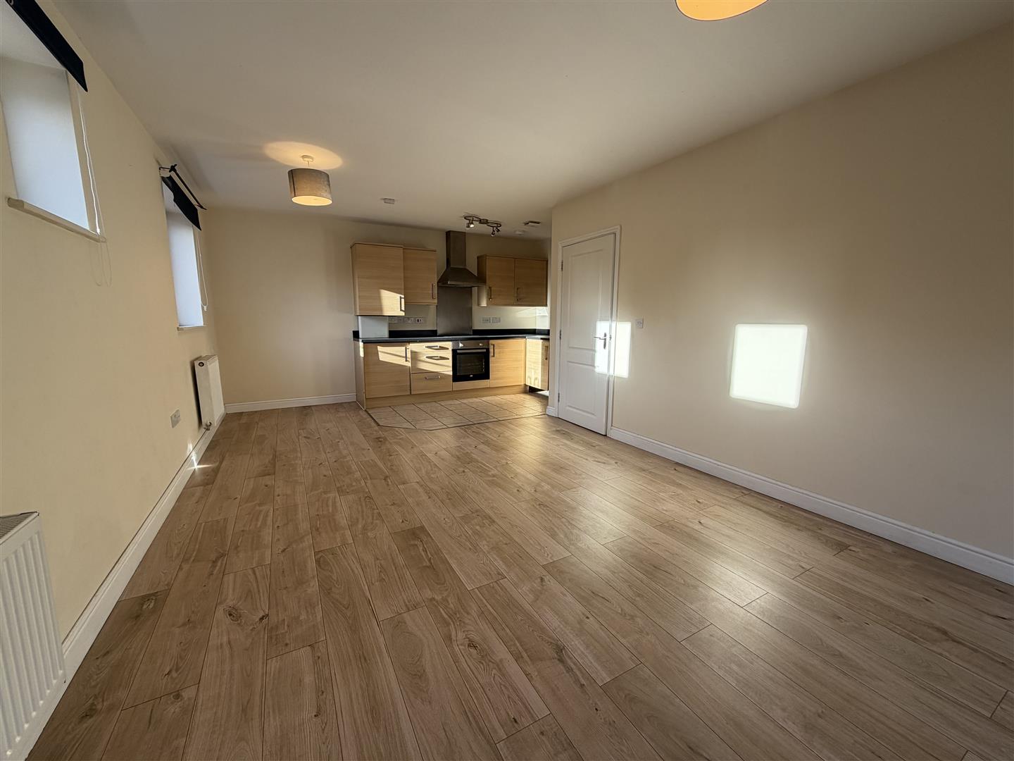 Open-plan kitchen and lounge area, bright and airy, ideal for relaxing or entertaining. Built in fridge.
