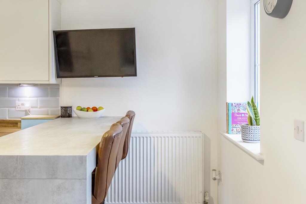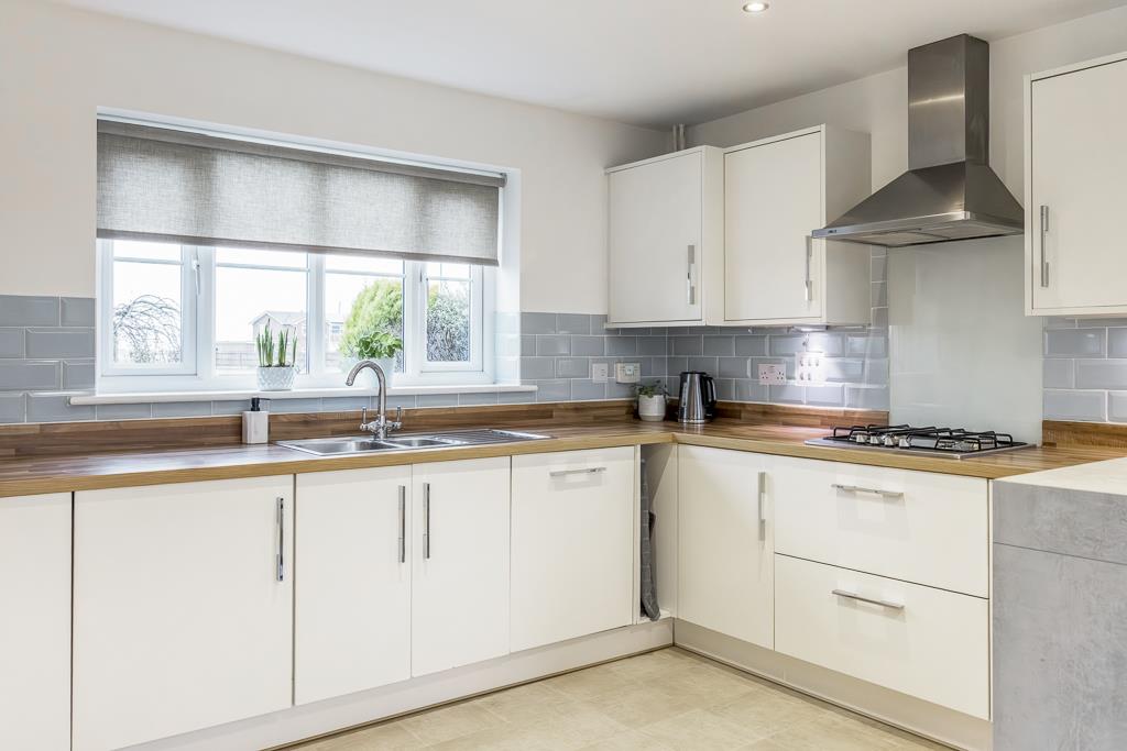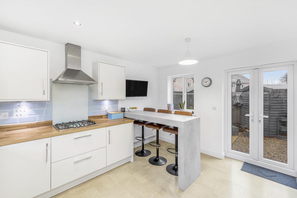 UPVC window to front and rear. French doors to rear. Matching range of base and eye level units with work surfaces over. Sink unit with drainer and mixer tap. Four ring gas hob with extractor hood over. Built in eye level oven and grill. Integrated dishwasher. Integrated washing machine. Space for tumble drier. Integrated fridge freezer. Radiator. Vinyl flooring.