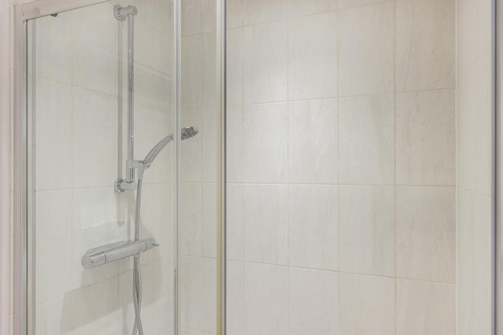 Shower cubicle with shower. Toilet. Wash hand basin. Wall mounted heated towel rail. Partially tiled walls. Vinyl flooring.