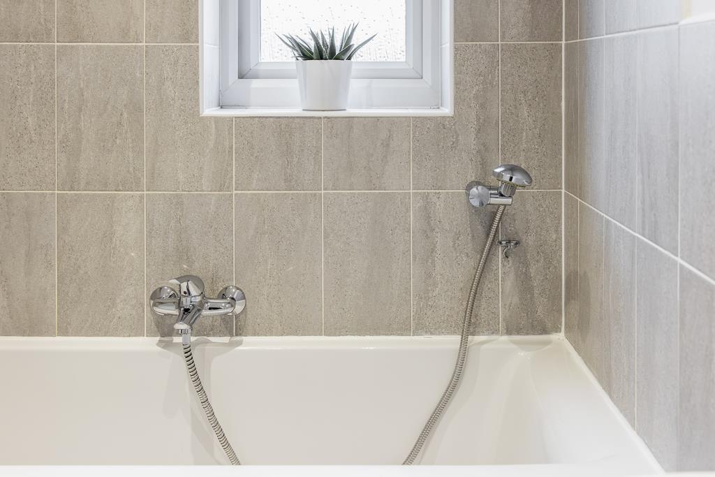 UPVC window to front. Panelled bath with shower attachment. Toilet. Wash hand basin. Wall mounted heated towel rail. Partially tiled walls. Vinyl flooring.
