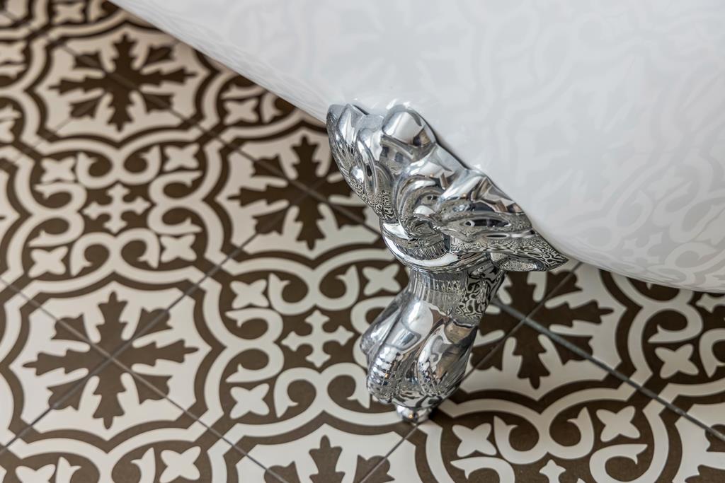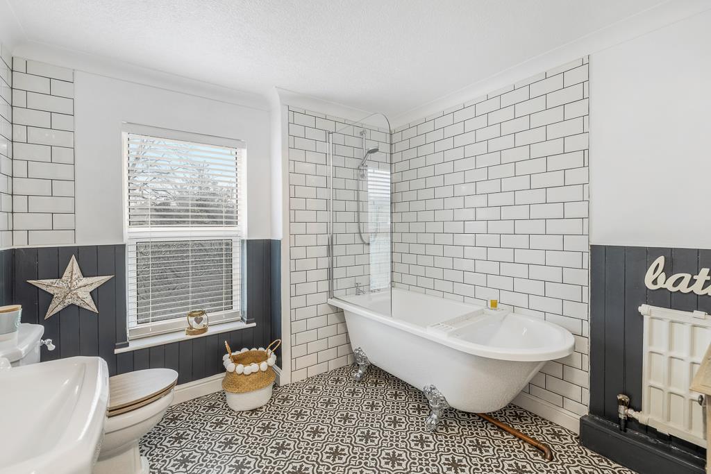 UPVC window to rear. Free standing roll top bath with shower over. Glass shower screen. Wash hand basin. Toilet. Panelled and tiled walls. Radiator. Tiled flooring.