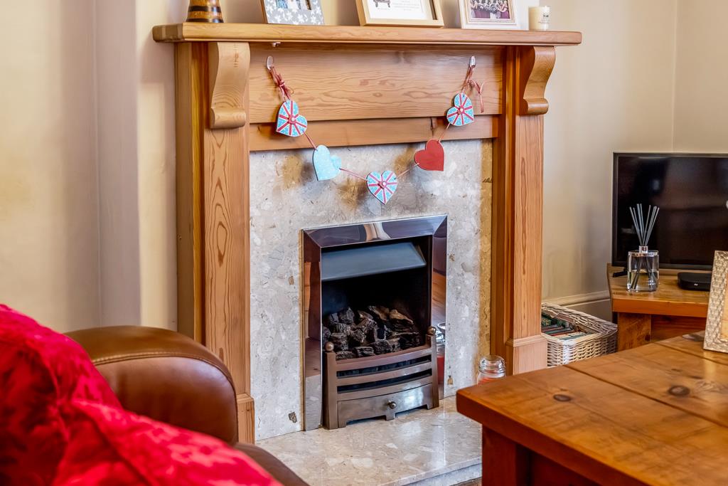 UPVC windows to side and rear. Open fireplace with tiled and wooden surround. Radiator. Carpeted. Understairs storage cupboard with shelving.