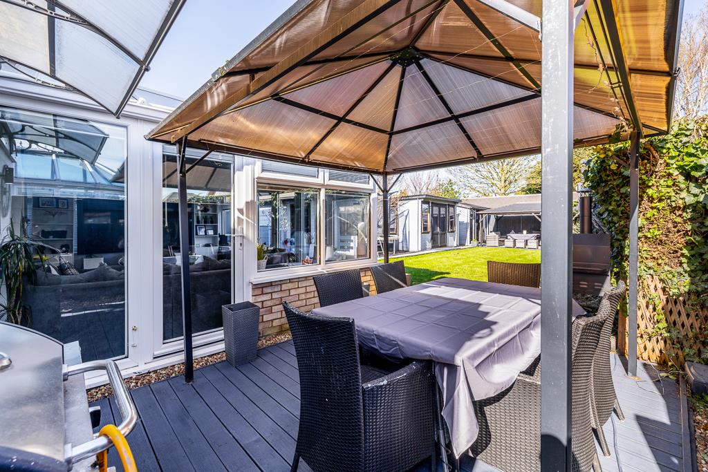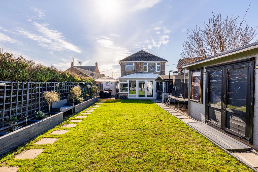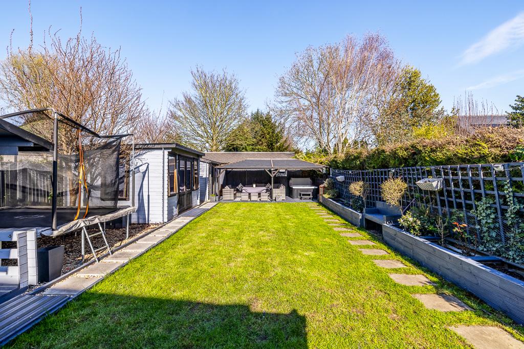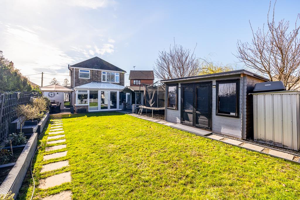 The rear garden is enclosed by timber fencing. Lawn area with raised borders. Timber decking. Landscaped seating and dining area with enclosed pergola with lighting and electric for hot tub (to be left by vendors).