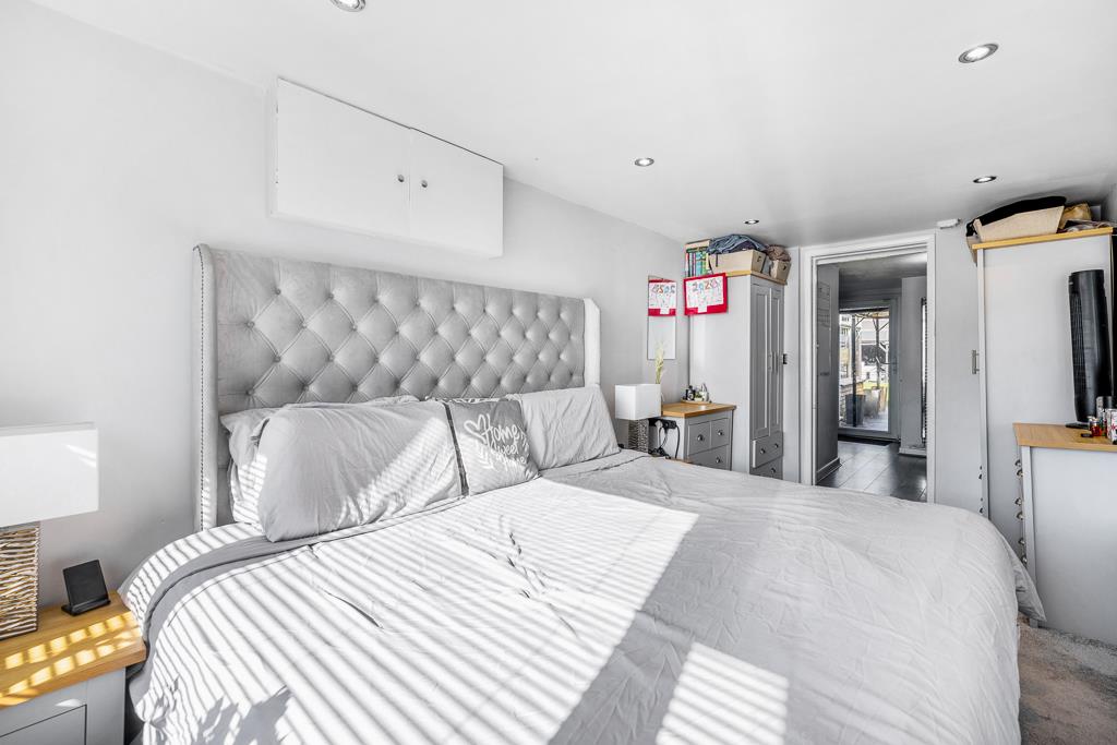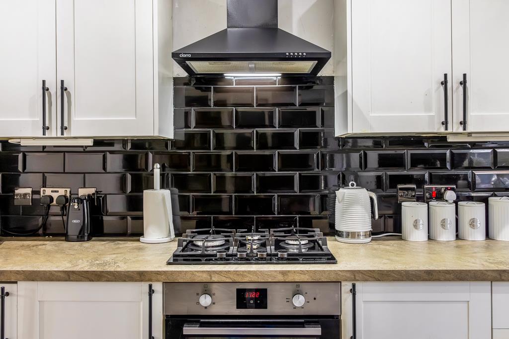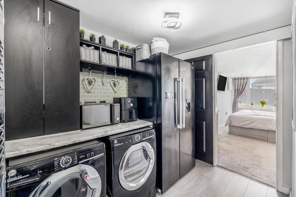 PVC double glazed door to rear. Door leading to bedroom. Matching base units with work surface over. Space for American style fridge/freezer. Wall-mounted gas boiler. Space and plumbing for washing machine and tumble dryer. Tiled splash back. Wall mounted heated towel rail. Wood effect flooring.