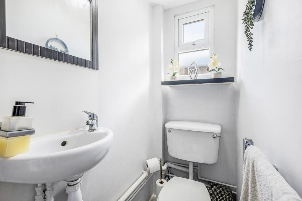 PVC double glazed window to side. Toilet. Wash hand basin with mixer tap over. Tiled flooring. Radiator.