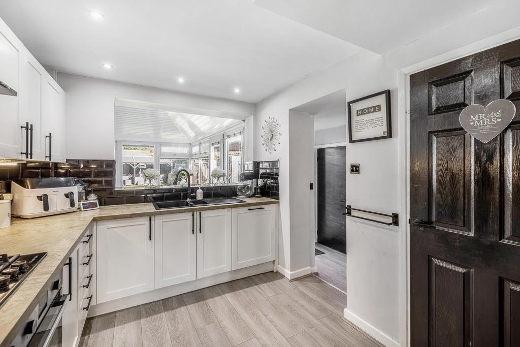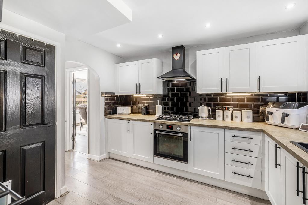PVC double glazed window to rear. Matching base and eye level units with work surface over. Sink unit with drainer and mixer tap over. Integrated electric oven and grill with a four burner gas hob. Extractor hood. Integrated dishwasher. Integrated fridge. Tiled splash back. Wood effect flooring. Understairs storage cupboard. Pantry with shelving.