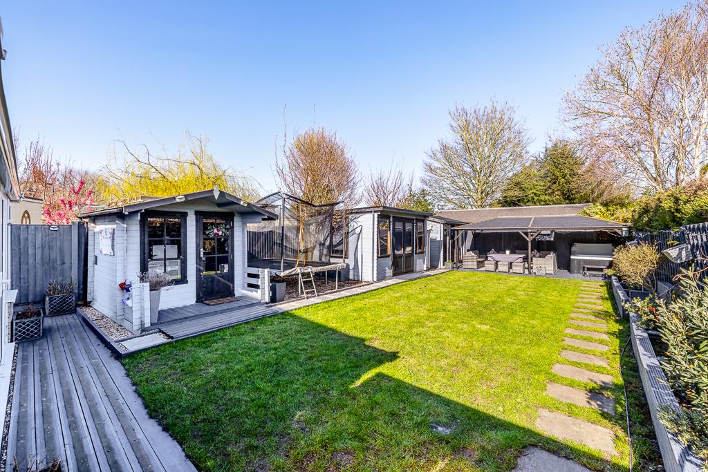 The landscaped garden has been carefully designed to make the most of the generous space, featuring multiple entertaining areas, including a further seating area at the bottom of the garden complete with a hot tub area – to be left by vendors.