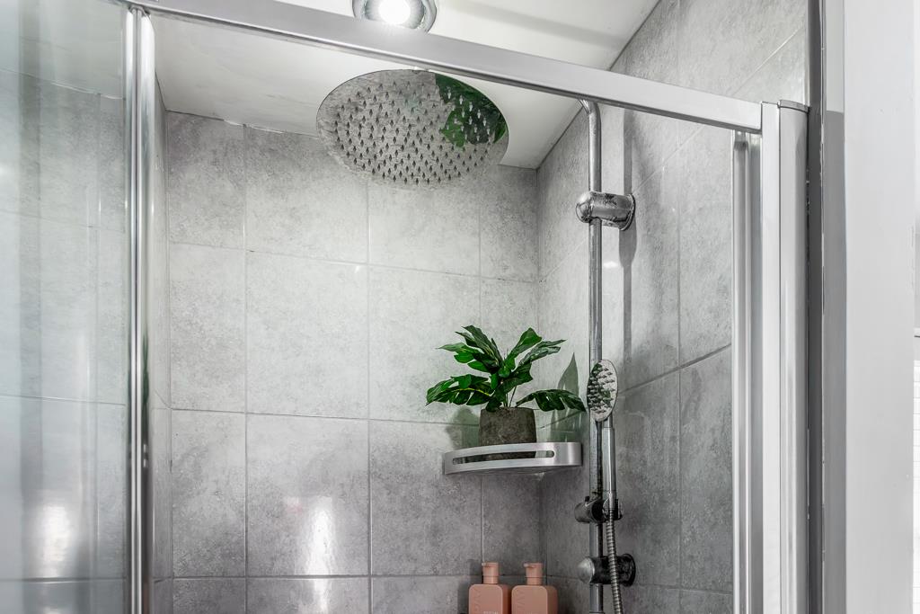 PVC double glazed window to rear. Toilet. Wash hand basin set in vanity unit with storage under. Panelled bath with taps over. Tiled shower cubicle with rainwater head and separate shower attachment. Partially tiled walls. Wall mounted heated towel rail. Vinyl flooring.
