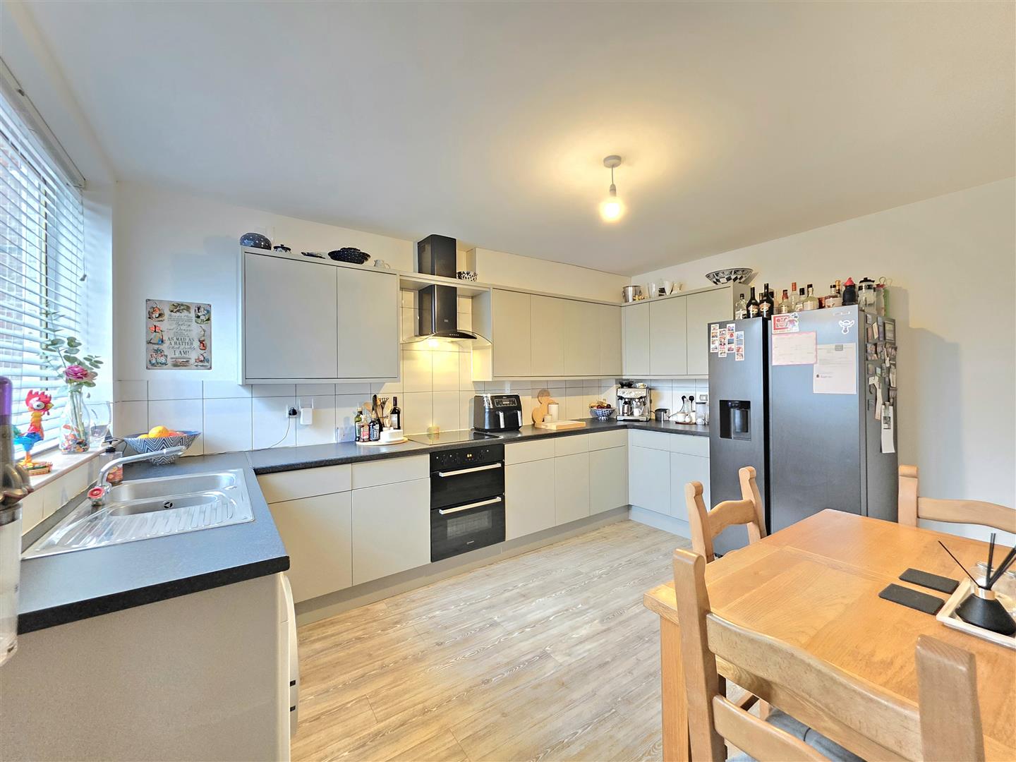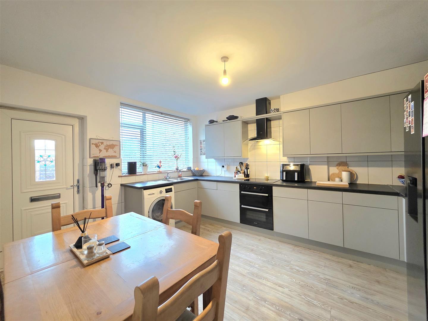 UPVC door and window. Matching base and eye level units with work surfaces over. Electric hob with extractor hood over. Built in oven and grill. Tiled splash backs. Space for American style fridge/freezer. Space and plumbing for washing machine. Radiator. Wood effect flooring. Built in storage cupboard.