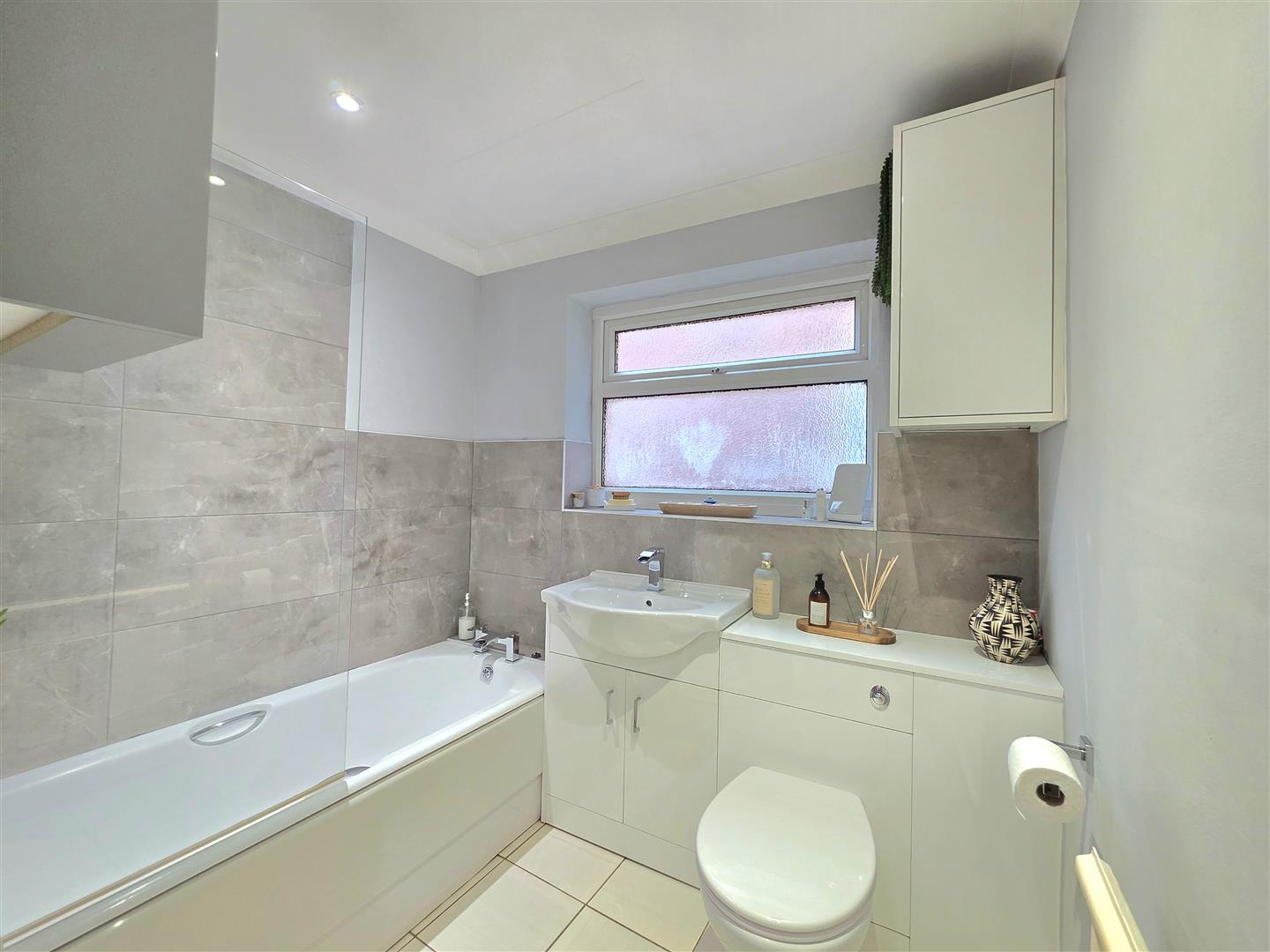 UPVC window. Panelled bath with shower over. Glass shower screen. Wash hand basin set in vanity unit. Toilet. Partially tiled walls. Tiled flooring.