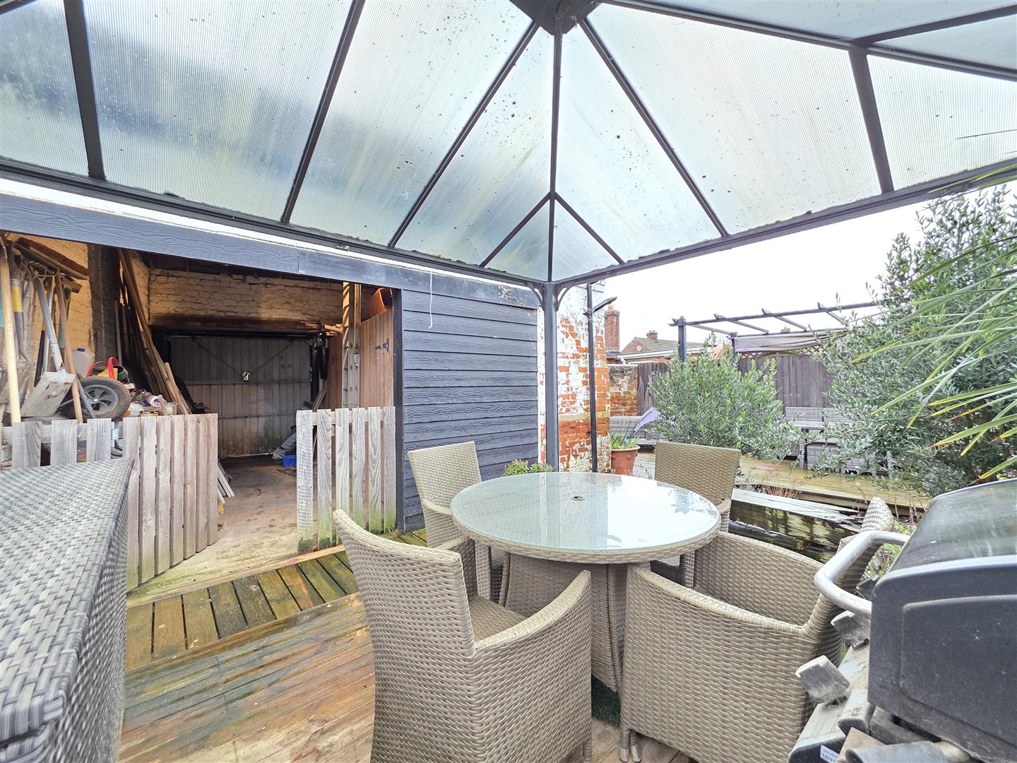 Outside, the garden has been cleverly divided into several distinct areas, ideal for relaxing, entertaining, or gardening. The property further benefits from useful outbuildings and a garage, adding practicality to its charm.