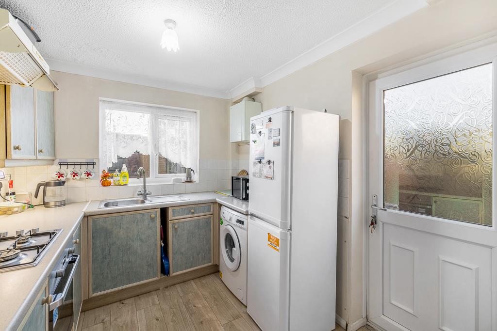 PVC double glazed window to rear. Coving to ceiling. Laminate flooring. Radiator. Wall mounted mains gas central heating boiler. Fitted with matching range of base and eye level units with roll edge work surface and tiled splash back. Four ring gas hob with extractor hood over. Integrated electric oven and grill. Space and plumbing for washing machine. Space for fridge/freezer. PVC double glazed door to side.