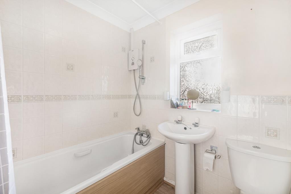 PVC double glazed window to rear. Coving to ceiling. Extractor fan. Laminate flooring. Radiator. Fitted bath with chrome mixer tap and shower attachment. Electric shower. Close coupled toilet with push button flush. Pedestal wash hand basin.