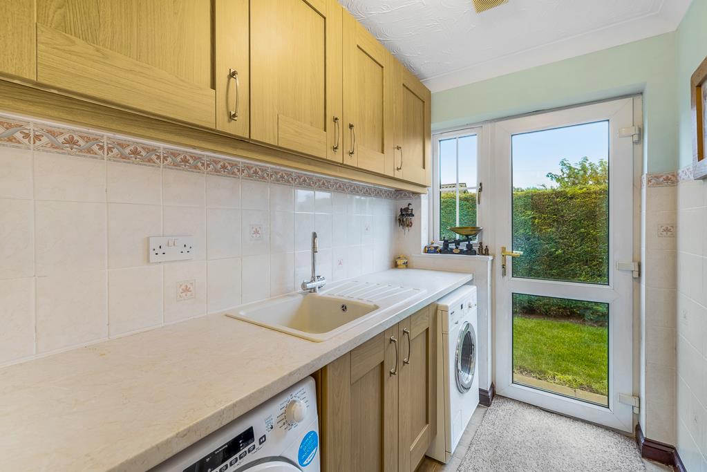 UPVC door with glazed side panel to side. Radiator. Tiled flooring. Matching base and eye level units with work surface over. Composite sink drainer with mixer tap. Space and plumbing for washing machine. Space for tumble dryer.