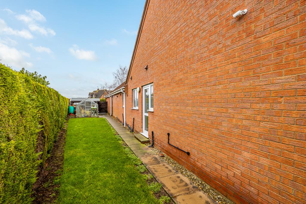The side of the property has pedestrian access doors to the garage. Enclosed by hedging. Timber shed. Greenhouse. Lawn area. Pathway leading to the rear garden.