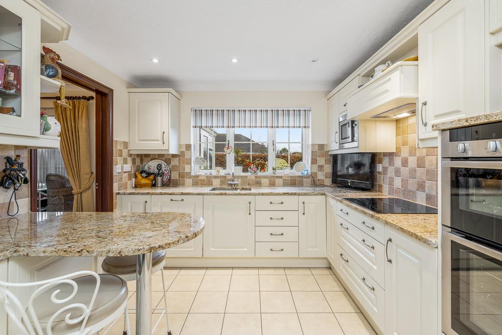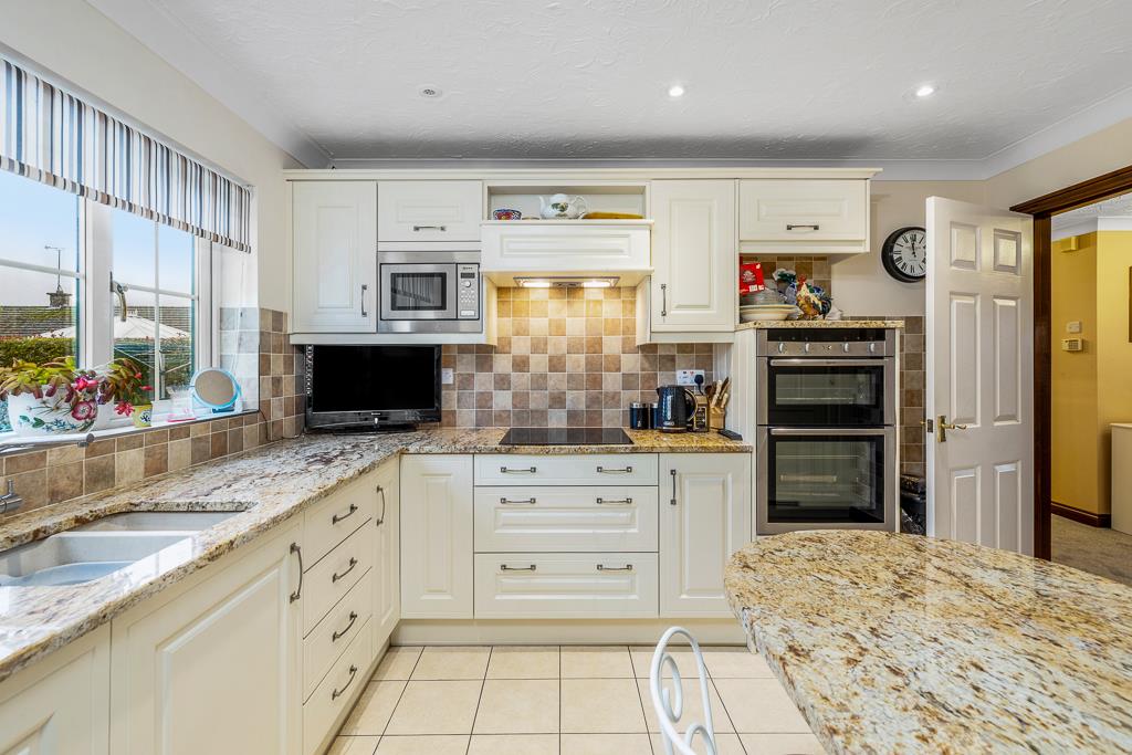UPVC window to rear. Matching range of base and eye level units with marble effect work surfaces over. Inset sink unit with drainer and mixer tap. Neff built in eye level oven and grill. Bosch integrated induction hob with extractor hood over. Tiled splash back. Built in Neff microwave. Integrated dishwasher. Built in fridge and freezer. Pull out larder. Radiator. Tiled flooring.