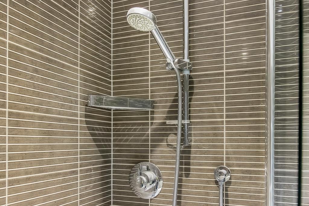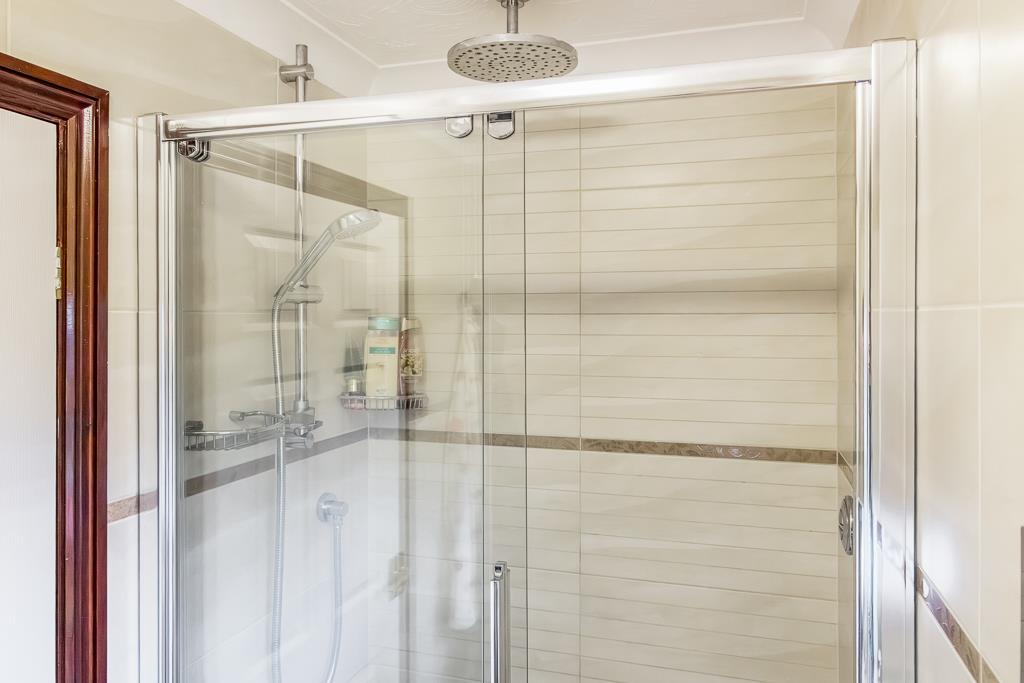 UPVC window to side. Wall mounted heated towel rail. Tiled flooring. Fully tiled walls. Walk in double shower with rainfall head and separate shower attachment over. Wash hand basin set in vanity unit. Concealed cistern toilet. Extractor fan.