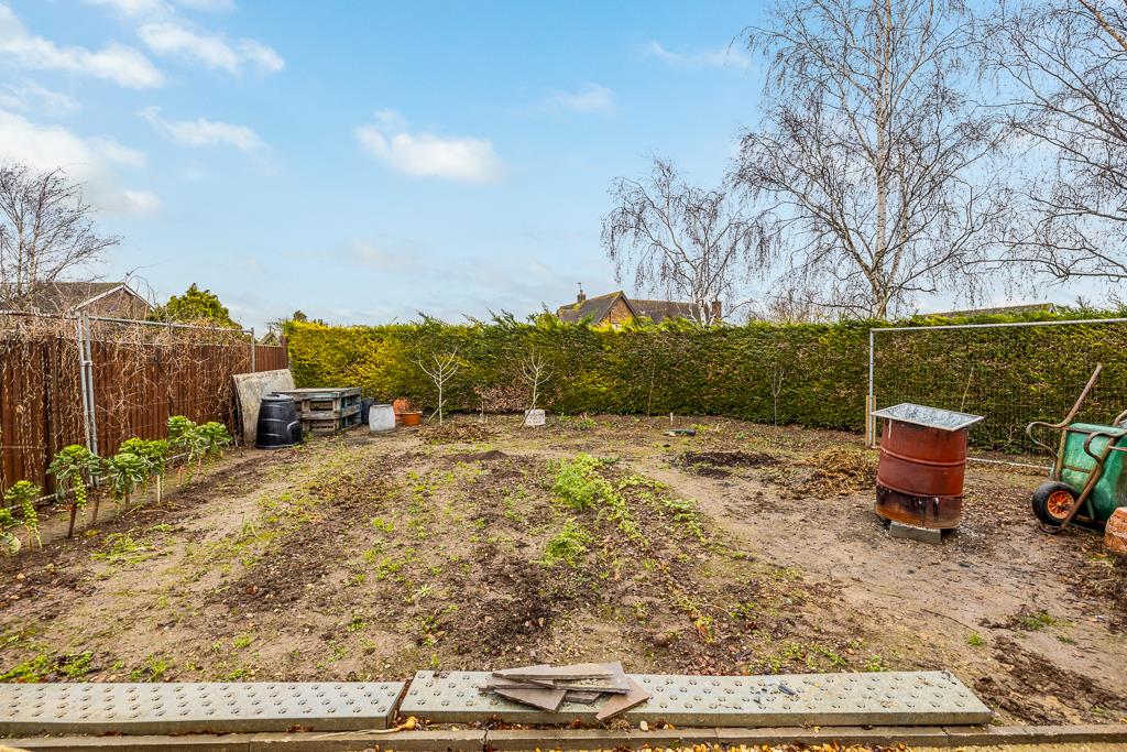 The rear garden is enclosed by timber fencing and hedging. Lawn area. Patio seating area.